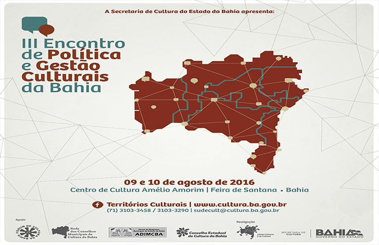 A Secretaria de Cultura do Estado da Bahia (SecultBA) abre inscrições para o III Encontro de Política e Gestão Culturais. O evento, adiado em dezembro de 2015, acontece nos dias 09 e 10 de Agosto de 2016. Será no Centro de Cultura Amélio Amorim - espaço cultural administrado pela SecultBA - em Feira de Santana, Território de Identidade Portal do Sertão. As inscrições podem ser feitas a partir de quarta, 13 de julho, até o dia 08 de agosto, através de formulário eletrônico disponível na internet.