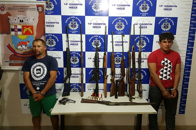 Com Flaldemir foram encontradas uma pistola calibre 765, quatro espingardas calibre 28,16 e 36, três carabinas, um simulacro de fuzil e uma luneta. Já com Damião, um rifle calibre 44 e dez cartuchos foram apreendidos. A dupla foi encaminhada para a 14ª Coordenadoria de Polícia do Interior (Irecê) onde é ouvida pelo delegado titular Roberto Leal.