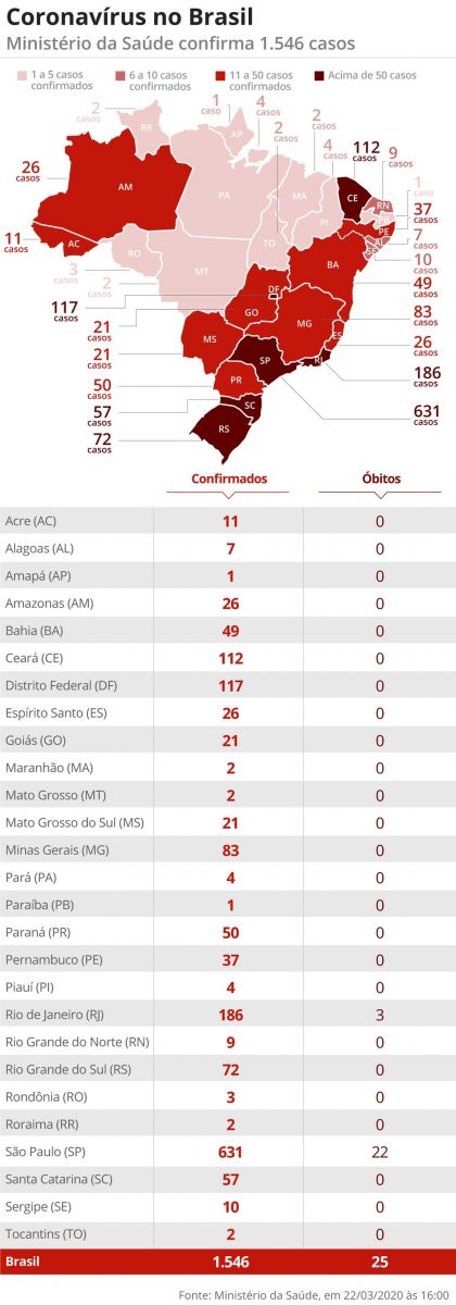 O Brasil tem 1.546 casos confirmados de novo coronavírus e 25 mortes até este domingo (22), diz o ministério da Saúde. Foram relatados 418 casos a mais em relação ao balanço anterior, de sábado, um aumento de 37%. E 7 mortes foram contabilizadas nas últimas 24 horas.