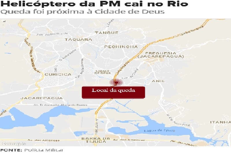 Imagens feitas pelo helicóptero da Polícia Militar que caiu na Zona Oeste do Rio no fim da tarde do sábado (19) flagraram suspeitos armados caminhando pelas ruas da Cidade de Deus. Todos os ocupantes, quatro policiais militares, morreram. O helicóptero dava suporte às ações da PM na região, que foi palco de intensos tiroteios. Policiais da UPP da Cidade de Deus trocaram tiros com criminosos.