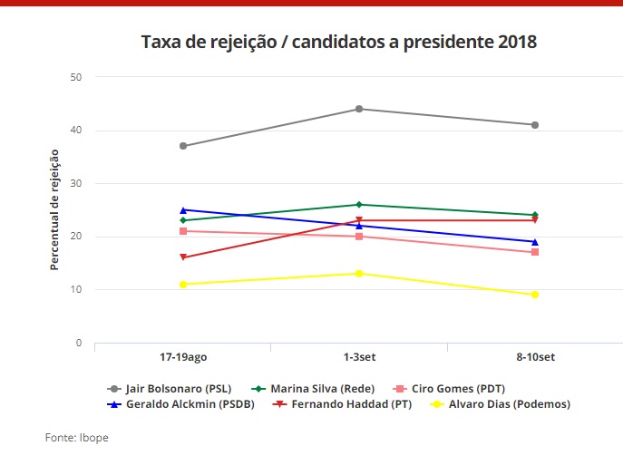 O Ibope também mediu a taxa de rejeição (candidatos nos quais o eleitor diz que não votará de jeito nenhum). Nesse item, os entrevistados puderam escolher mais de um nome. Veja os índices:
