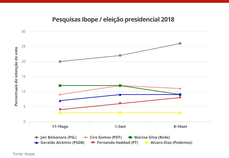 O Ibope divulgou nesta terça-feira (11) o resultado da mais recente pesquisa de intenção de voto na eleição presidencial. Os resultados foram os seguintes: