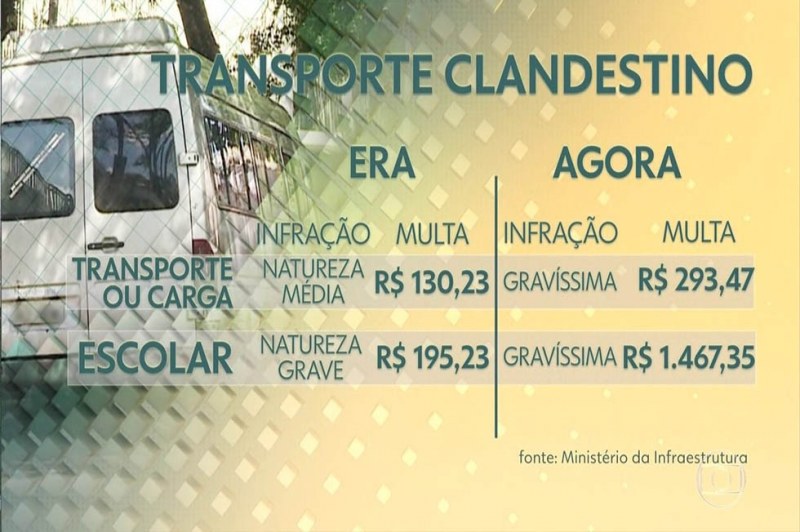Para transporte escolar sem licença, a infração era considerada grave. Agora, além de ser gravíssima, terá a multa multiplicado por 5 e leva 7 pontos na Carteira Nacional de Habilitação (CNH), além de prever a remoção do veículo. Com a mudança, o valor cobrado passa de R$ 195,23 para R$ 1.467,35.