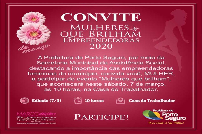 "Nossas ações voltadas ao empoderamento feminino é contínuo desde o início da minha gestão, quando implementamos significativos projetos voltados à informação, proteção e garantia de direitos", destaca a gestora municipal, Cláudia Oliveira, muito satisfeita com o a postura protagonista das mulheres de Porto Seguro. "Tornamo-nos forte porque entendemos as necessidades e lutas uma das outras e demos nossas mãos", disse a prefeita, convidando a comunidade para também prestigiar a solenidade do sábado, na Casa do Trabalhador.