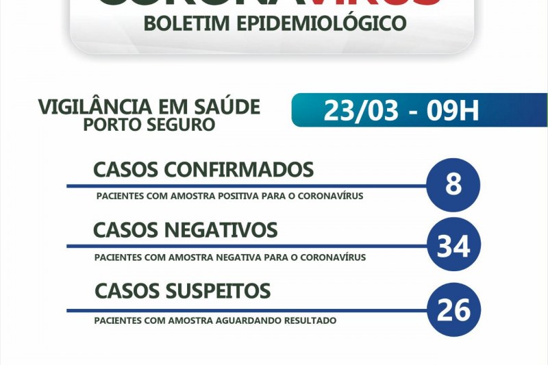A Prefeitura de Porto Seguro, em ação integrada à Secretaria de Saúde, emitiu oficialmente nesta segunda-feira, 23/03, às 9h, Boletim Epidemiológico atualizado acerca dos casos confirmados, negativos e suspeitos, com a finalidade de manter informada a população sobre o Coronavírus.