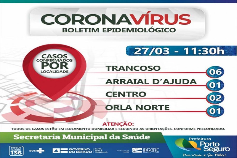 A Prefeitura de Porto Seguro, em ação integrada a Secretaria de Saúde, emite oficialmente nesta sexta-feira, 27/03, às 16h, Boletim Epidemiológico atualizado sobre os casos confirmados, negativos e suspeitos, com o objetivo de manter informada a população sobre os casos de Coronavírus.