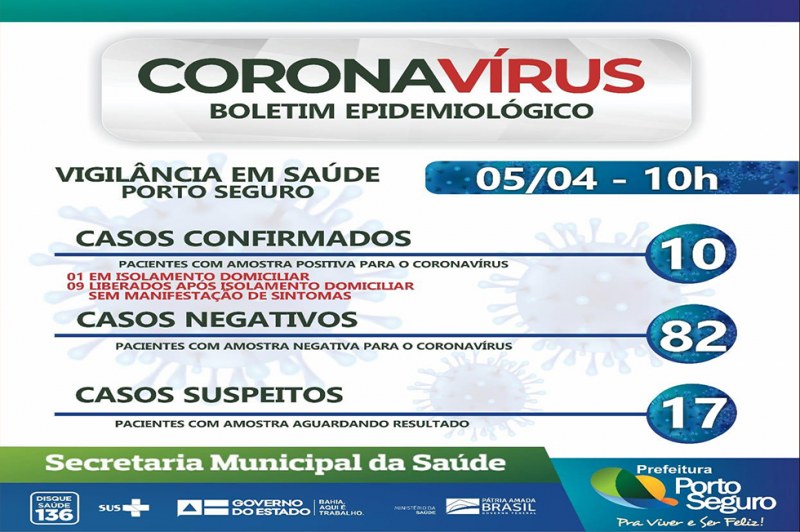 A Prefeitura de Porto Seguro, em ação integrada a Secretaria de Saúde, emite oficialmente nesta quinta-feira, 2/04, às 9h30, Boletim Epidemiológico atualizado sobre os casos confirmados em isolamento e liberados após isolamento, negativos e suspeitos, com o objetivo de manter informada a população sobre os casos de Coronavírus.