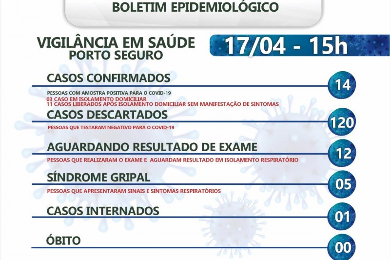 A Prefeitura de Porto Seguro, em ação integrada a Secretaria de Saúde, emite oficialmente nesta sexta-feira -feira, 17/04, às 15h, Boletim Epidemiológico atualizado sobre os casos confirmados, descartados, aguardando resultado de exame, síndrome gripal e internados, com o objetivo de manter informada a população sobre os casos de coronavírus.