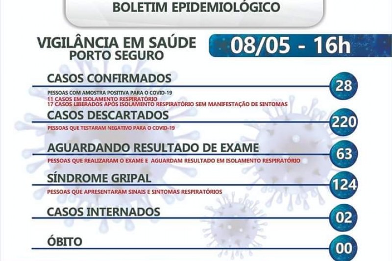 Na tarde de sexta-feira 08/05, a prefeitura de Porto Seguro, em ação integrada a Secretaria de Saúde, emitiu oficialmente às 16h, Boletim Epidemiológico atualizado sobre os casos confirmados, descartados, aguardando resultado de exame, síndrome gripal e internados, com o objetivo de manter informada a população sobre os casos de coronavírus.