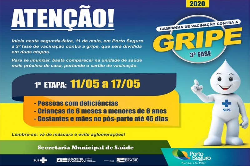 Começa nesta segunda-feira, 11 de maio, a terceira fase da Campanha de Vacinação contra a Gripe Influenza no município de Porto Seguro. Para tanto, a terceira fase será dividida em duas etapas: A primeira, que segue até 17 de maio, é destinada ao público-alvo composto por pessoas com deficiência, crianças de seis meses a menores de seis anos, gestantes e mães no pós-parto até 45 dias.