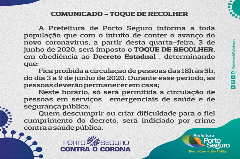Porto Seguro e mais 18 municípios do Extremo Sul da Bahia terão toque de recolher a partir desta quarta-feira, 3/6, ficando proibida a circulação de pessoas depois das 18h. A medida foi anunciada pelo governador da Bahia, Rui Costa, e será válida até dia 9/6. O toque de recolher é mais uma ação que visa conter a proliferação do coronavírus na região, onde algumas cidades têm registrado taxa de transmissão acima da média do Estado, que é de menos de 5%.