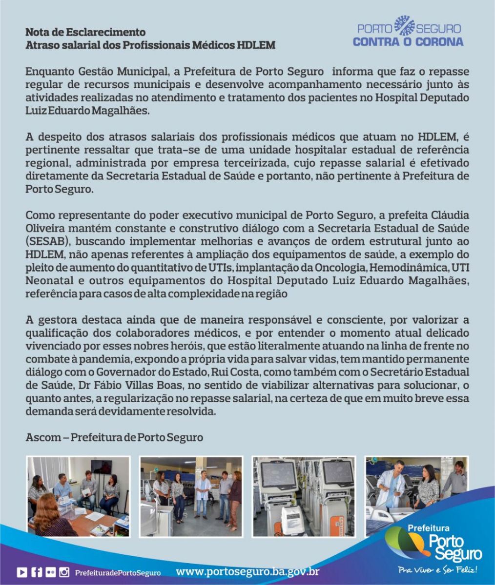 A despeito dos atrasos salariais dos profissionais médicos que atuam no HDLEM, é pertinente ressaltar que trata-se de uma unidade hospitalar estadual de referência regional, administrada por empresa terceirizada, cujo repasse salarial é efetivado diretamente da Secretaria Estadual de Saúde e portanto, não pertinente à Prefeitura de Porto Seguro.
