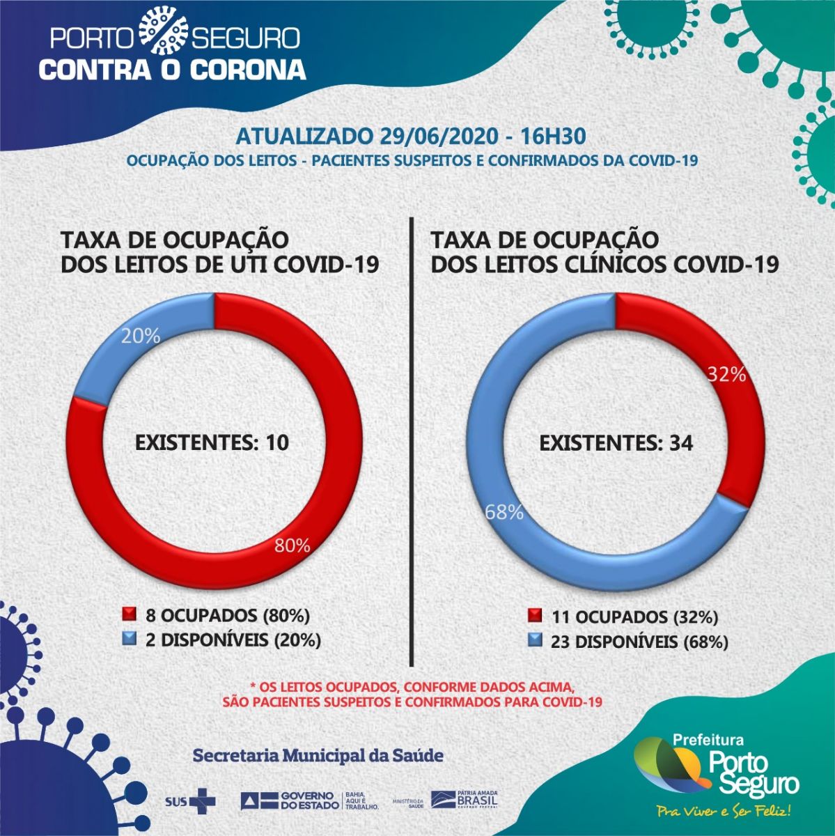 Porto Seguro apresenta um quadro de 537 casos positivos, dos quais 218 pessoas estão curadas; 303 pacientes em quarentena domiciliar; 10 pacientes internados; 123 pessoas aguardando resultado de exames e 06 óbitos. A Secretaria Municipal de Saúde segue monitorando 507 pacientes com sindrome gripal.