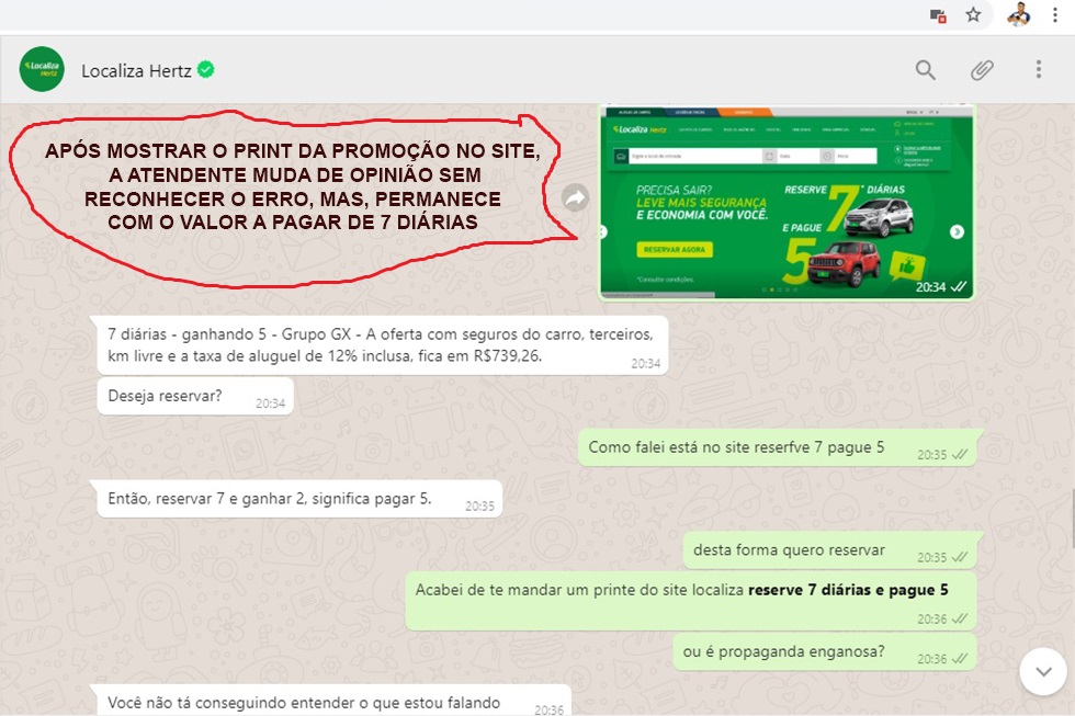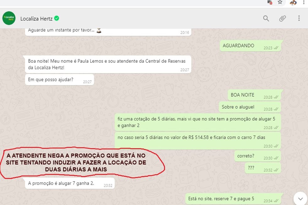 AENGANAÇÃO: Ao questionar sobre a promoção, inicialmente a atendente disse “A Promoção é Alugar 7 Diárias e Ganhar 2”, mesmo argumentando que estava no site, a atendente insistia na forma por ele apresentada. Após tirar um PRINT do site e enviar para ela, a mesma disse, ”Então, reservar 7 e ganhar 2, significa pagar 5”, ou seja, fez de conta que não havia tentado enganar.