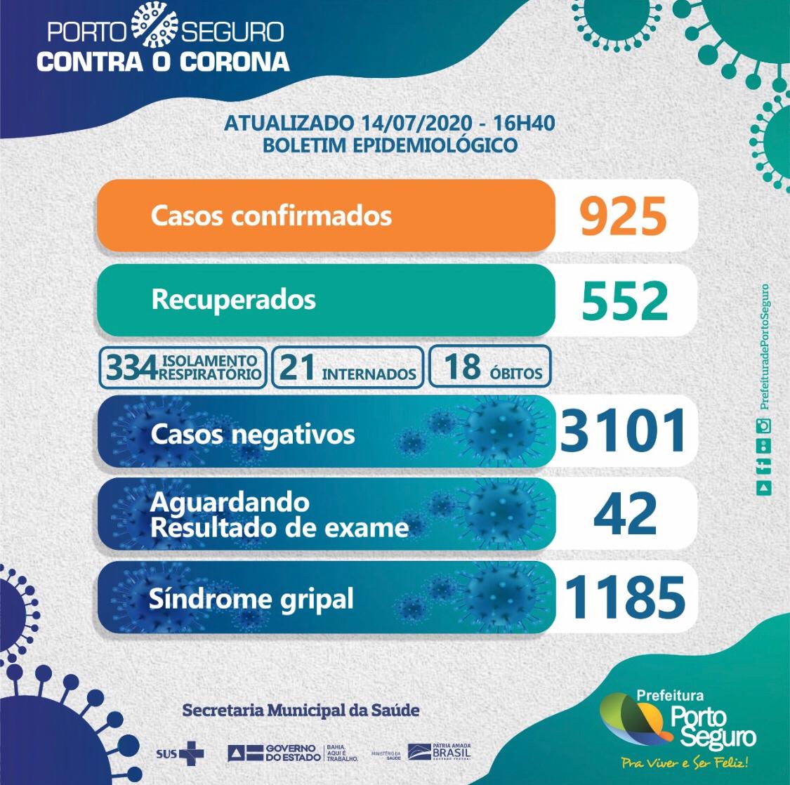 Porto Seguro apresenta um quadro de 925 casos positivos, dos quais 552 pessoas estão curadas; 334 pacientes em quarentena domiciliar; 21 pacientes internados; 42 pessoas aguardando resultado de exames e 18 óbitos. A Secretaria Municipal de Saúde segue monitorando 1.185 pacientes com sindrome gripal.