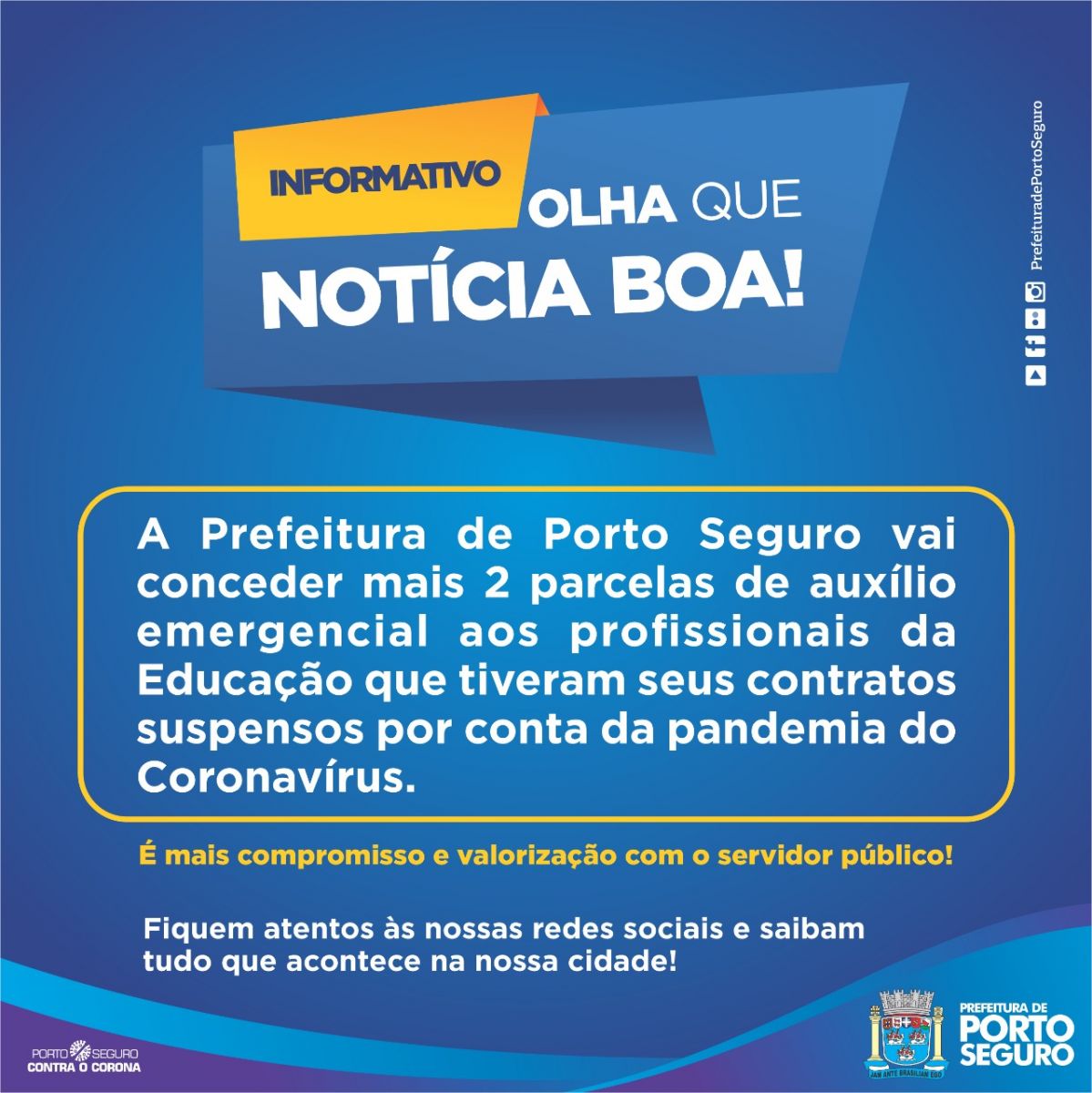 A Prefeitura de Porto Seguro prorrogou por mais 2 meses o pagamento do auxílio para os profissionais da Educação que tiveram seus contratos suspensos por conta da pandemia. A decisão foi anunciada pela prefeita Cláudia Oliveira, após reunião com a participação das secretárias de Educação, Janis Souza e Assistência Social, Luciana Parracho.