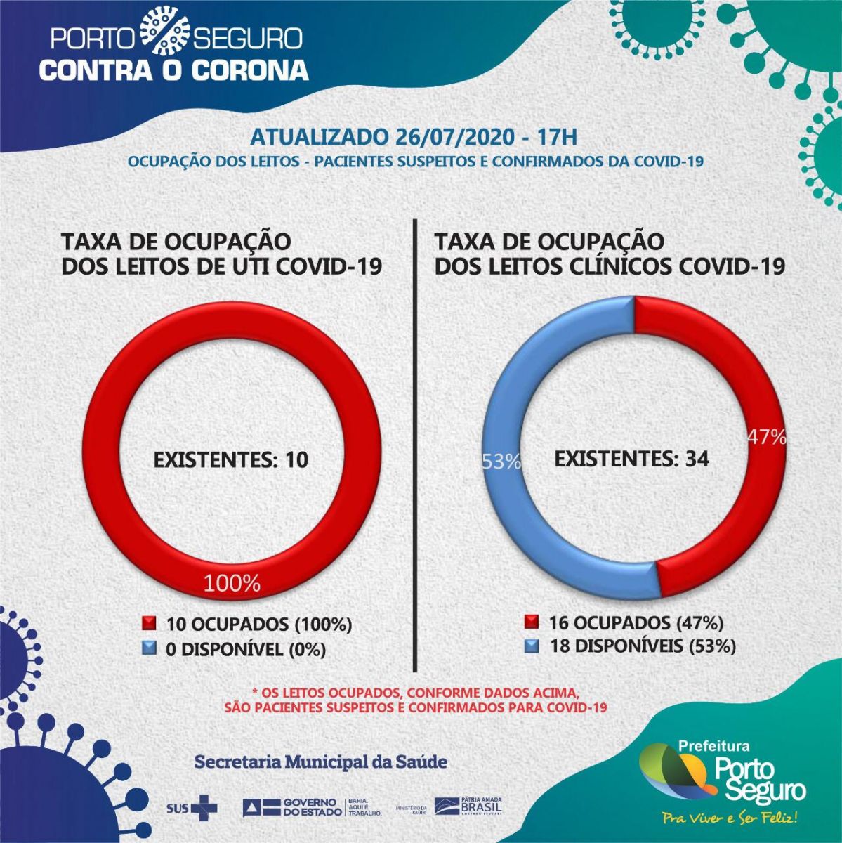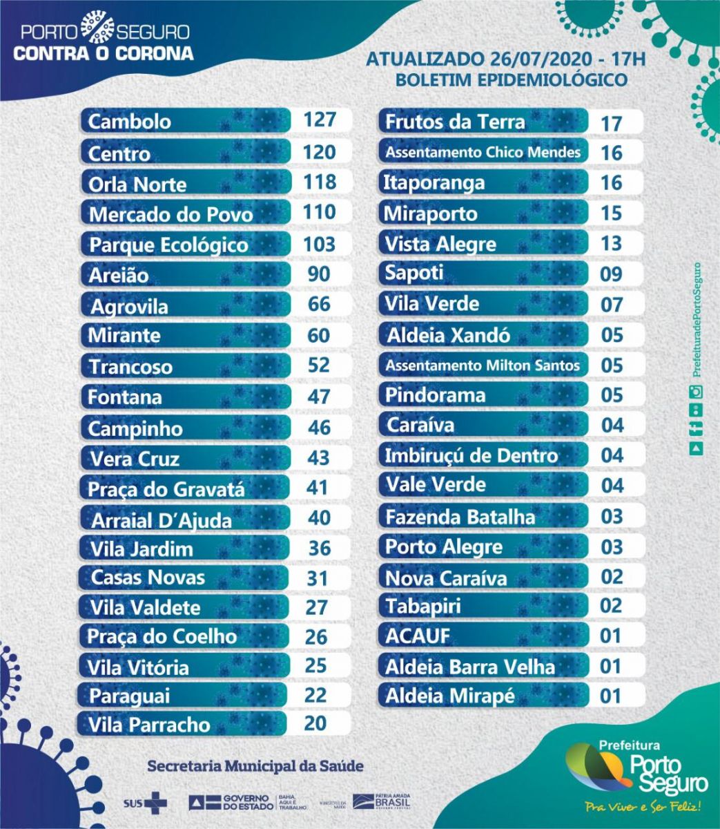 Porto Seguro apresenta um quadro de 1.383 casos positivos, dos quais 990 pessoas estão curadas; 351 pacientes em quarentena domiciliar; 20 pacientes internados; 102 pessoas aguardando resultado de exames e 22 óbitos. A Secretaria Municipal de Saúde segue monitorando 1.367 pacientes com sindrome gripal.