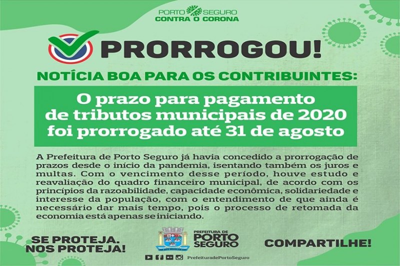 Após criteriosa análise do cenário econômico e das contas públicas do município, a prefeita de Porto Seguro, Cláudia Oliveira, juntamente com o secretário de Finanças, Davi Dultra, determinou a extensão do prazo para pagamento de todos os tributos municipais de 2020 até o dia 31 de agosto. "É uma fase muito difícil que estamos atravessando, mas venceremos com fé e trabalho. Estamos atentos à situação da nossa população, que agora terá mais prazo para saldar seus tributos junto ao município”, explicou.