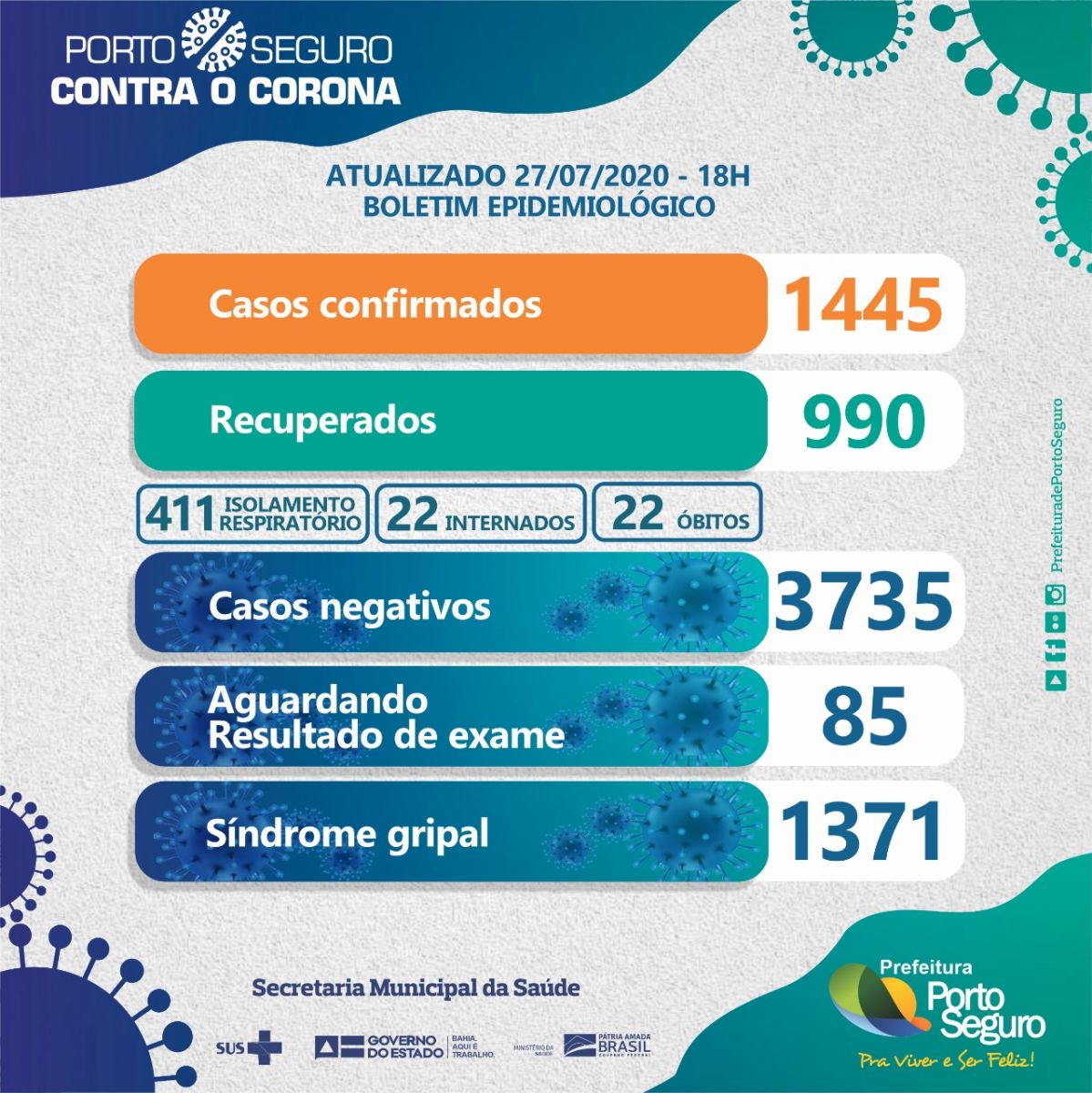 Porto Seguro apresenta um quadro de 1.445 casos positivos, dos quais 990 pessoas estão curadas; 411 pacientes em quarentena domiciliar; 22 pacientes internados; 85 pessoas aguardando resultado de exames e 22 óbitos. A Secretaria Municipal de Saúde segue monitorando 1.375 pacientes com sindrome gripal.