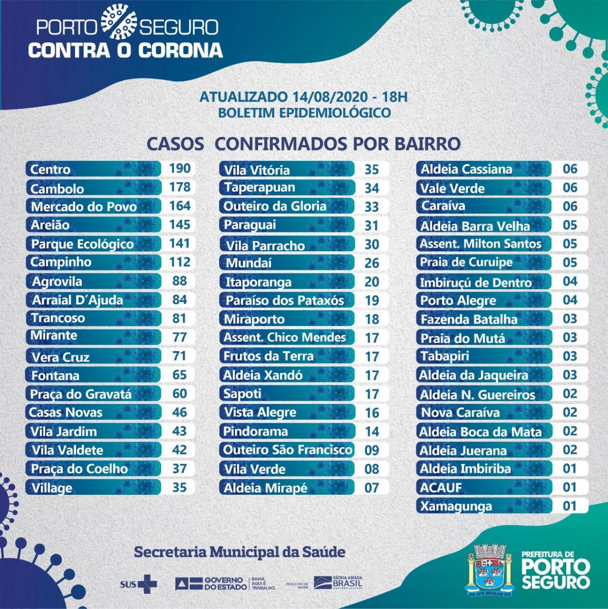 A Prefeitura de Porto Seguro, em ação integrada a Secretaria de Saúde, emite oficialmente nesta sexta-feira 14/08, às 18:00, Boletim Epidemiológico atualizado sobre os casos confirmados, descartados, aguardando resultado de exame, síndrome gripal e internados, com o objetivo de manter informada a população sobre os casos de coronavírus.