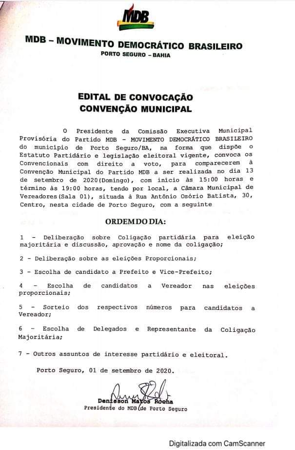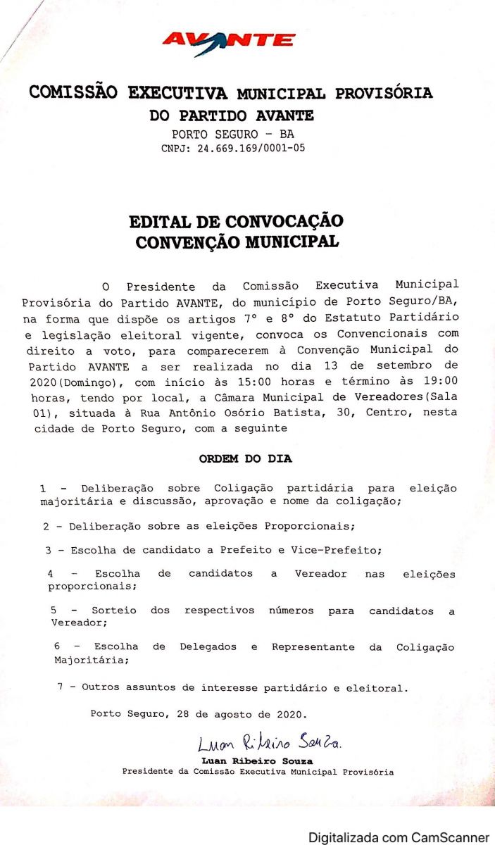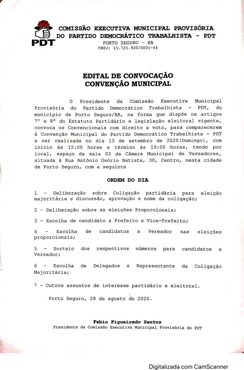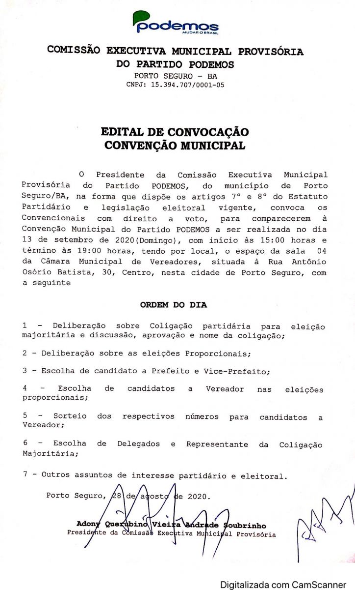 A convenção dos referidos partidos será realizada no domingo 13/09, no Plenário da Câmara Municipal de Porto Seguro das 13:00 às 19:00. Veja abaixo os editais de convocação de cada partido, bem como o rito a ser seguido durantes a convenção.