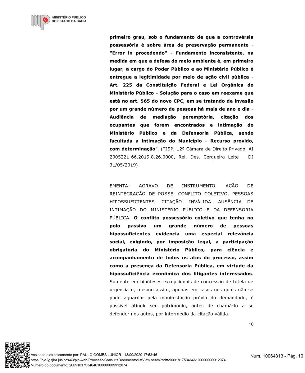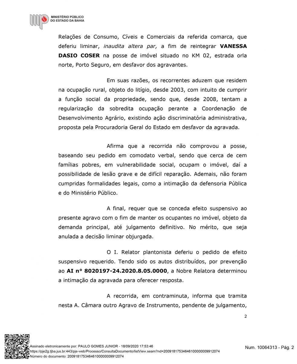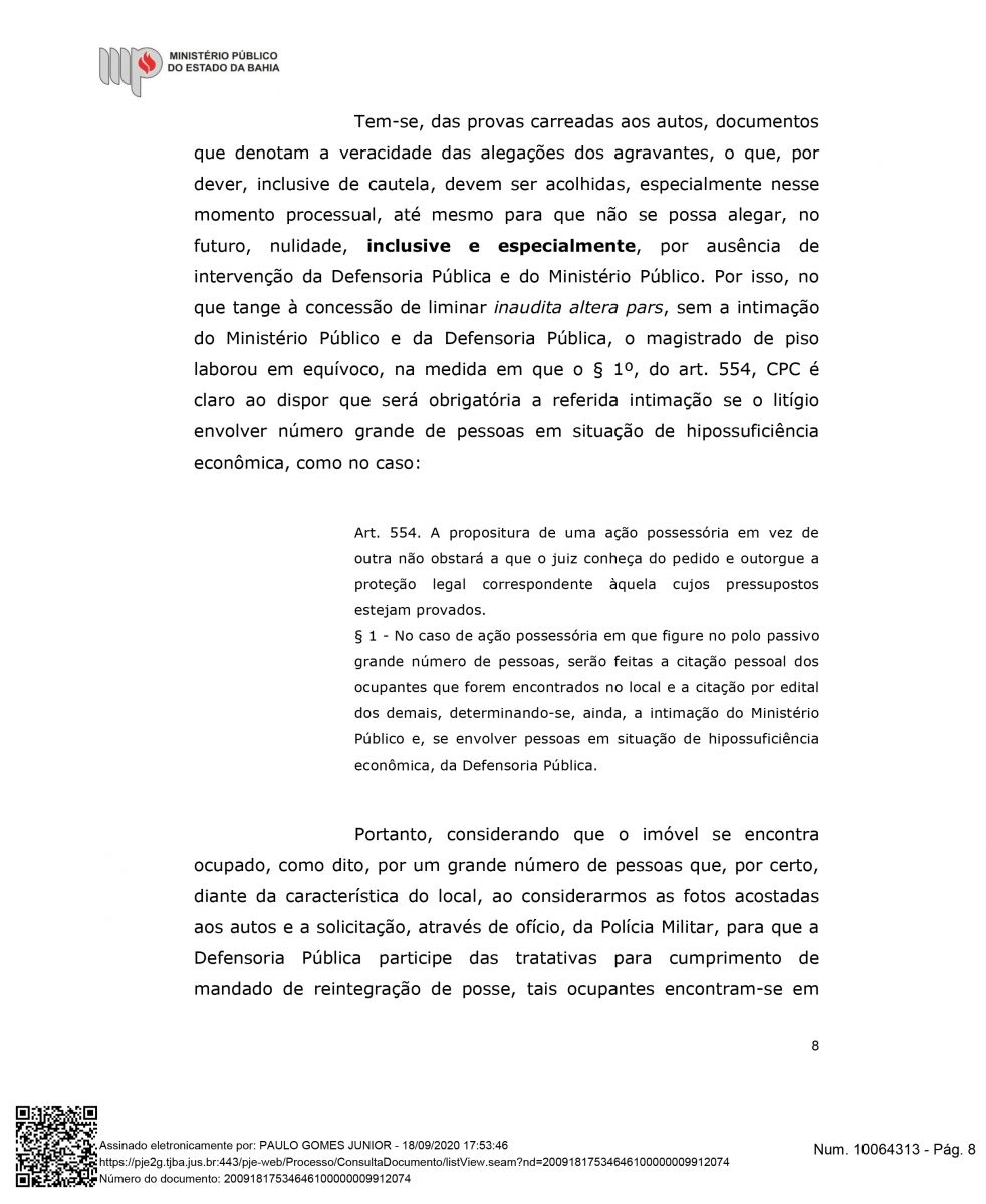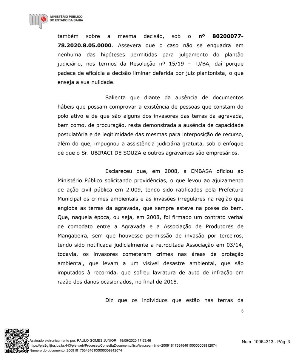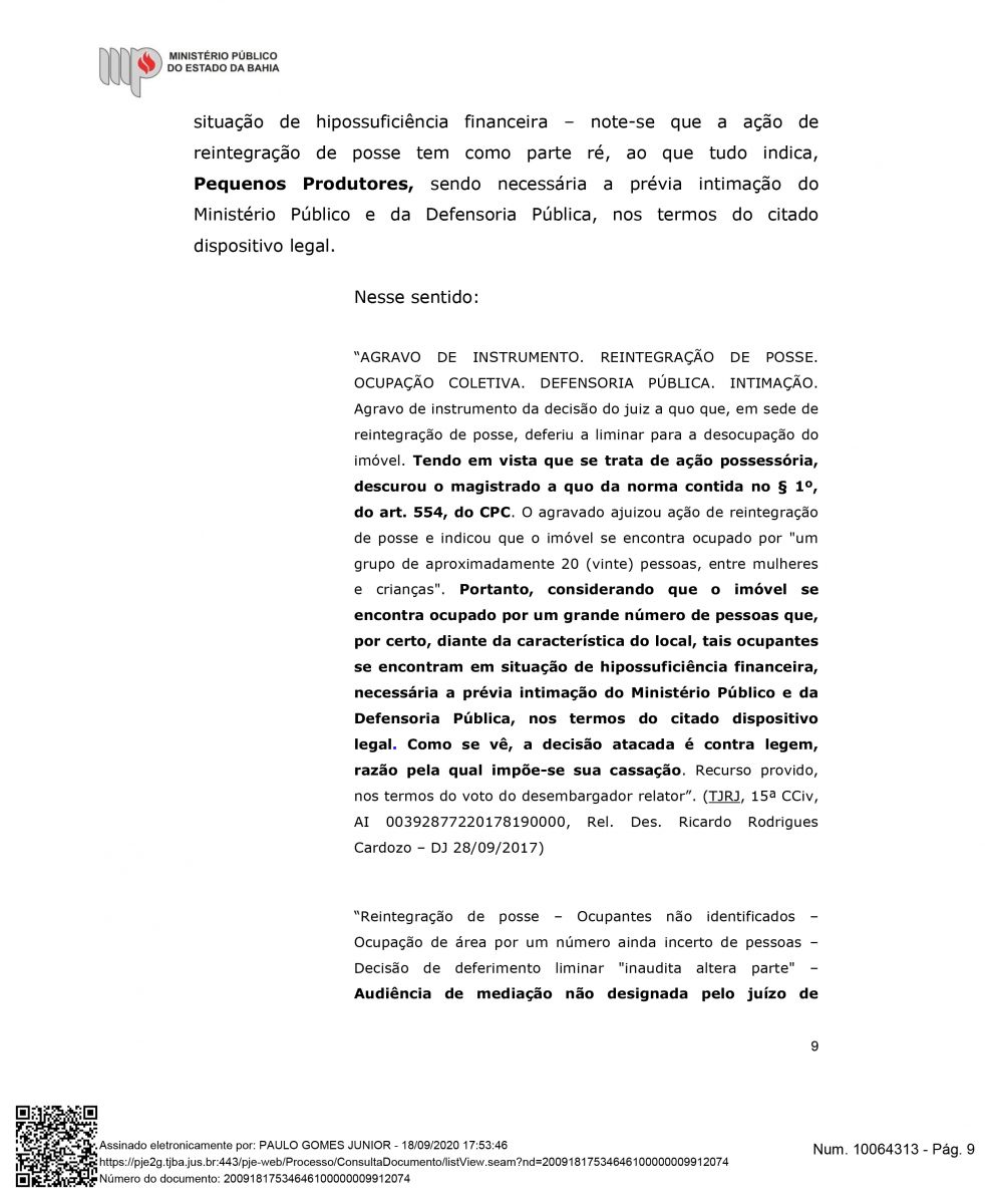 "Além do exito de impedir a retirada das famílias, esta semana Houve mais um desfecho favorável para a Associação Mangabeira, pois, o Ministérios Público Estadual deu parecer para o recebimento e provimento do agravo de instrumento, o que significa, que o MPBA entende a procedência interpostar por nós, ou seja, que este opinativo é favorável a permanência das famílias até o final do processo", declarou Drº Lourran Monteiro.