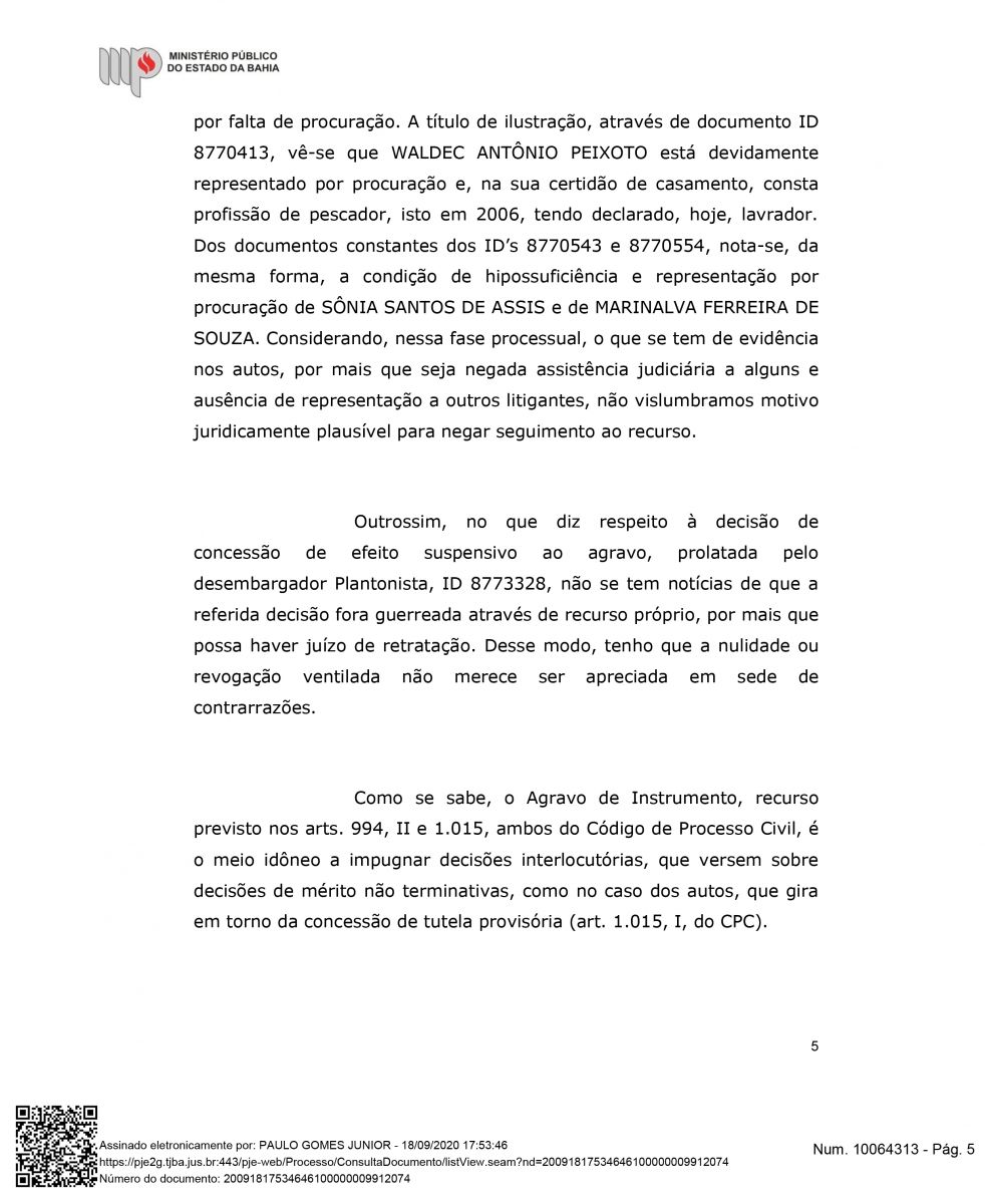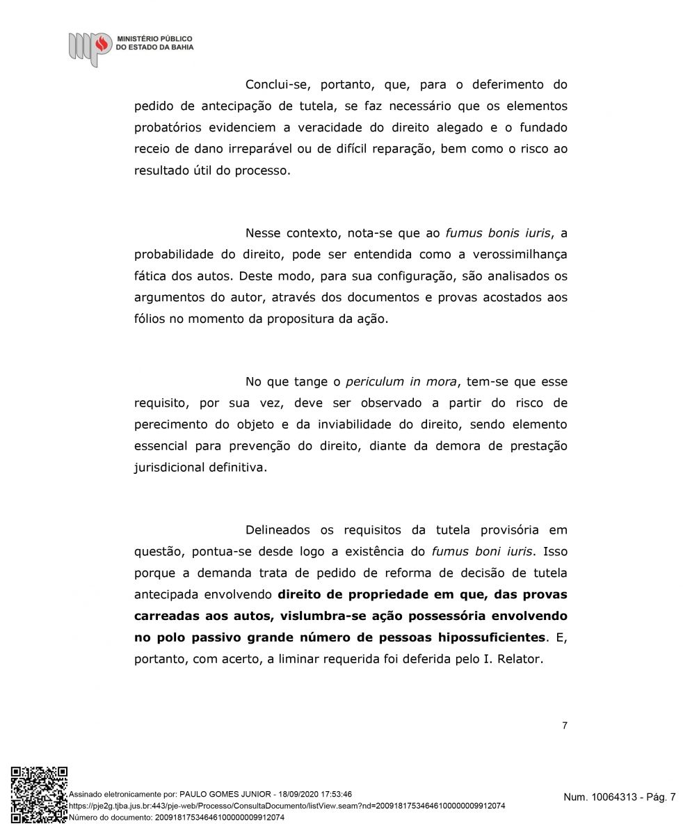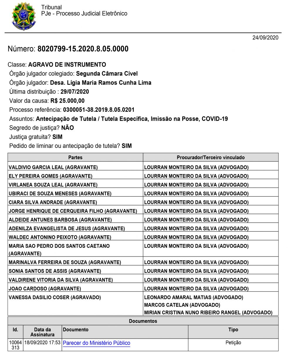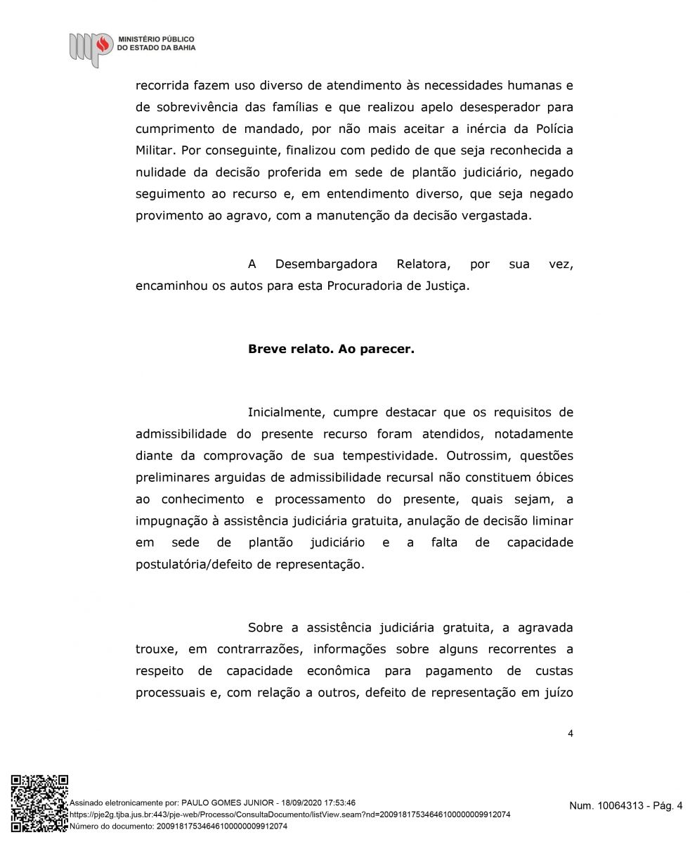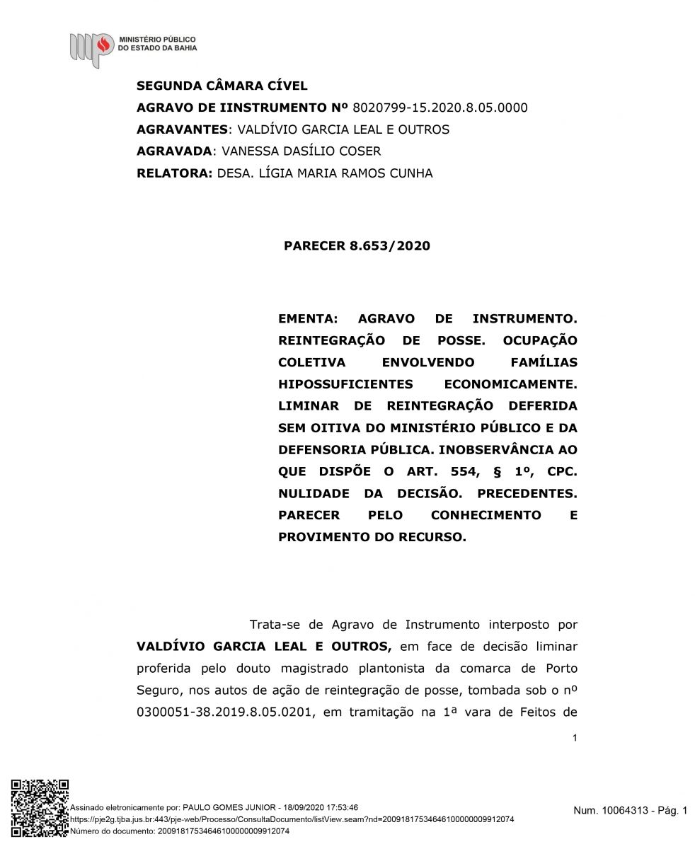 "Além do exito de impedir a retirada das famílias, esta semana Houve mais um desfecho favorável para a Associação Mangabeira, pois, o Ministérios Público Estadual deu parecer para o recebimento e provimento do agravo de instrumento, o que significa, que o MPBA entende a procedência interpostar por nós, ou seja, que este opinativo é favorável a permanência das famílias até o final do processo", declarou Drº Lourran Monteiro.