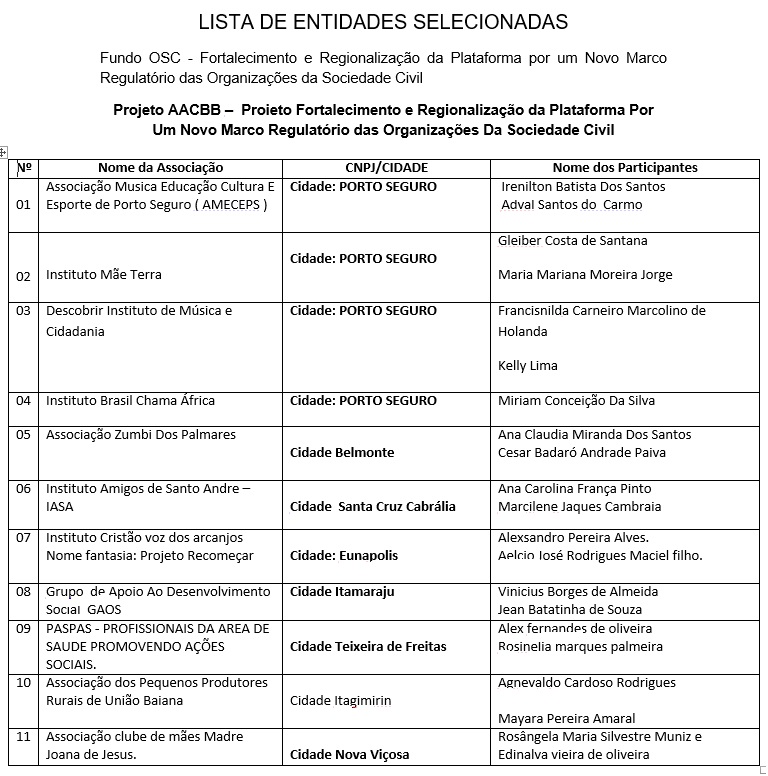 A entidade divulgou na manha desta terça, dia 29 de setembro de 2020, a lista de participantes de cidades selecionadas para participar do Curso de Multiplicadores do Marco Regulatório das Organizações da Sociedade Civil, nova legislação que regulamenta a atuação das entidades sociais e suas relações com o Poder Público, conhecida pela sigla MROSC.