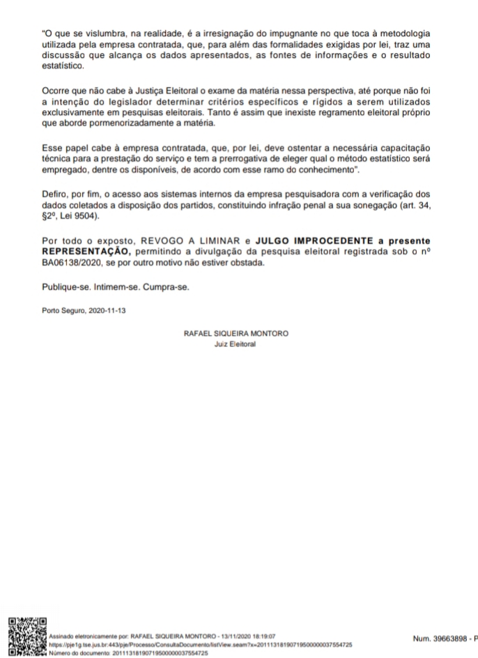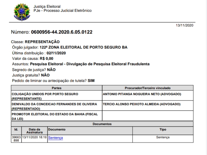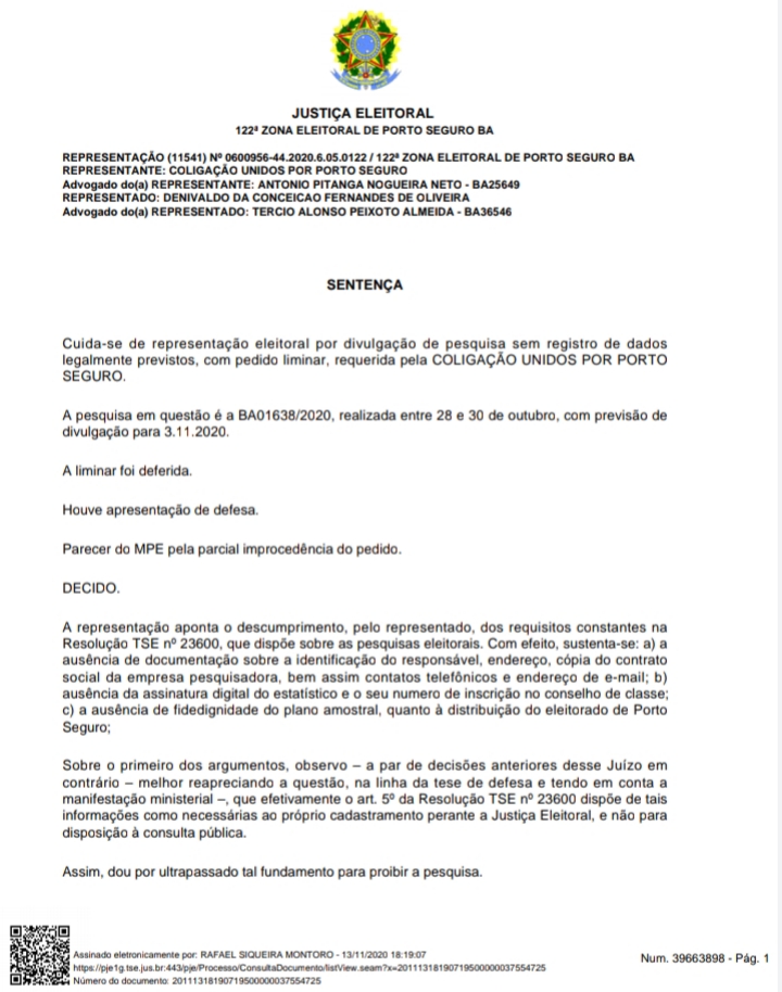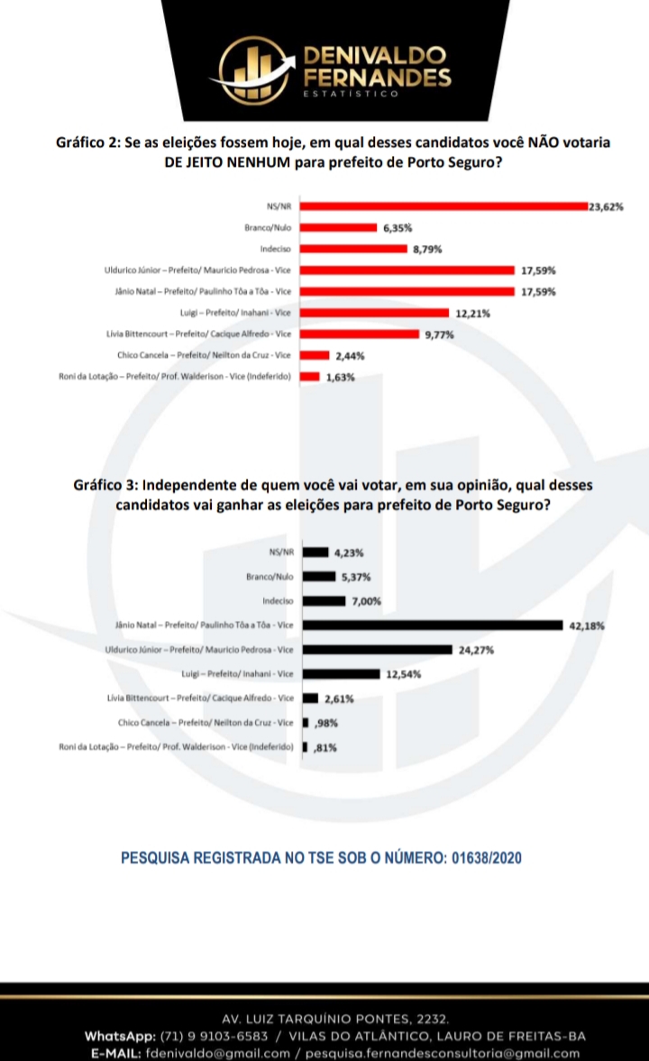 O Juiz Eleitoral Dr° Rafael Biqueira Montouro (122° Zona Eleitoral), autorizou a divulgação de pesquisa eleitoral em Porto Seguro, a qual foi Registrada no TSE - Tribunal Superior Eleitoral sob o N° 01638/2020. Realizada pela empresa Denivaldo Fernandes, CNPJ: 33.509.397/0001/09, a pesquisa entrevistou 600 eleitores entre os dias 28 e 30 de outubro de 2020, a margem de erro é de 4 pontos percentuais para mais ou para menos e possui 95% confiança.