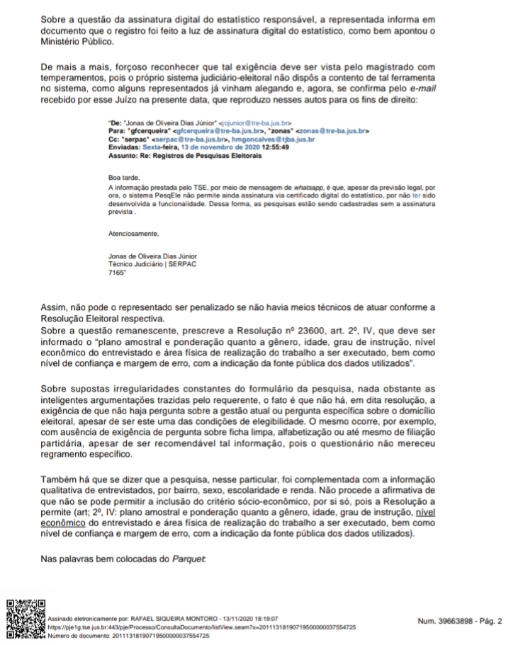 Na decisão, o Juiz entendeu que a pesquisa obedece todos os critérios previstos em lei, desta forma INDEFERIU o pedido da coligação opositora à Aliança do Bem por entender que a ação que tentava impedir a divulgação da pesquisa é uma RESIGNAÇÃO (Quando algém não aceita ou não se conformar com os fatos), desta forma o juiz concluiu que não há quaisquer irregularidades nos dados e resultados apurados. Veja abaixo a decisão na íntegra e gráficos da pesquisa.