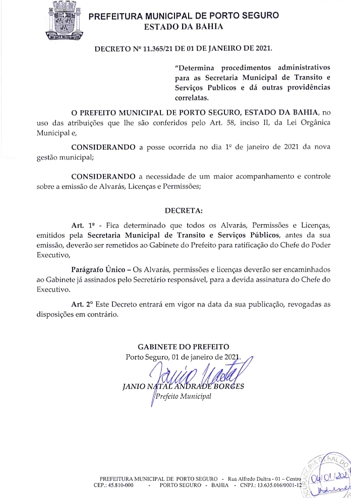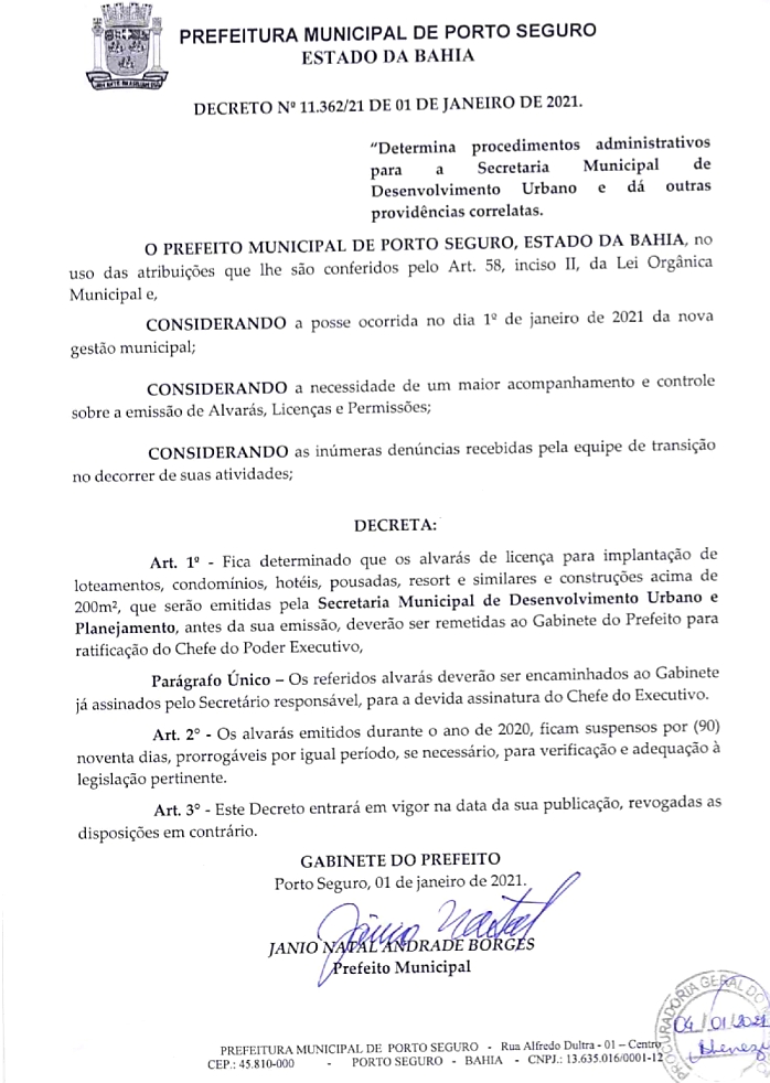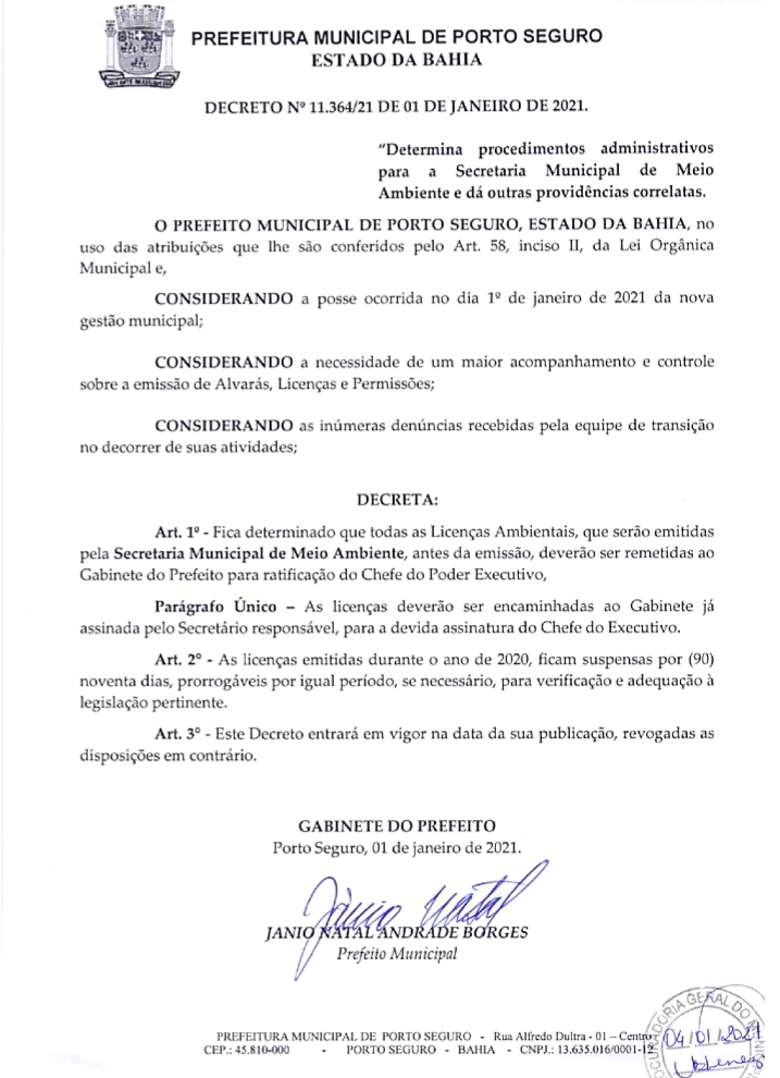 Nesta segunda-feira 04/01, oficialmente primeiro dias do executivo municipal, o prefeito Jânio Natal, assinou três decreto publicados no Diário Oficial sob o Nº 4.687, os quais suspende por 90 dias prorrogáveis pelo mesmo período, licenças, alvarás e permissões emitidas no ano de 2020.