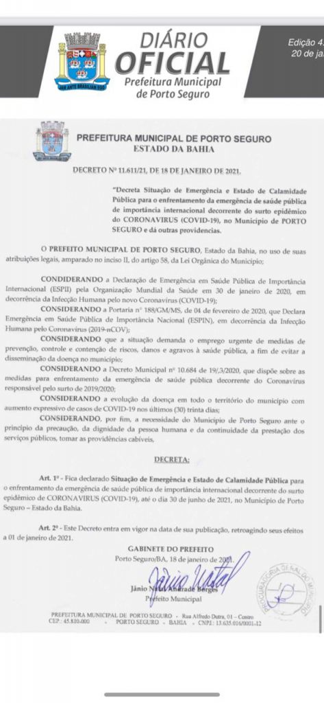 O prefeito de Porto Seguro, Jânio Natal, divulgou no Diário Oficial desta quarta-feira (20/01) decreto Nº 11.611/21 que estabelece Situação de Emergência e Estado da Calamidade Pública no Município de Porto Seguro. De acordo a publicação, o decreto se fez necessário devido a situação demandar o emprego urgente de medidas de prevenção, controle e contenção de riscos, danos e agravos à saúde pública, a fim de evitar a disseminação da doença no município.
