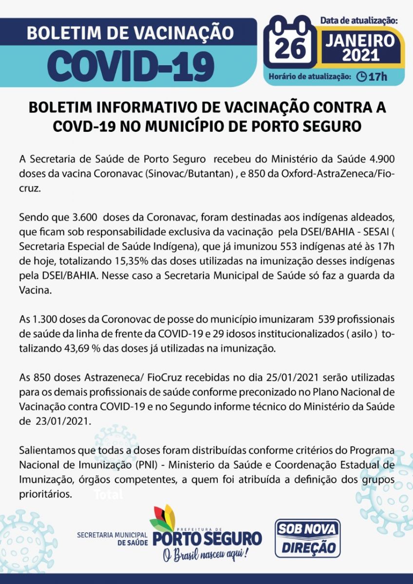 A Secretaria de Saúde de Porto Seguro recebeu do Ministério da Saúde 4.900 doses da vacina Coronavac (Sinovac/Butantan) , e 850 da Oxford-AstraZeneca/Fiocruz. Sendo que 3.600 doses da Coronavac foram destinadas aos indígenas aldeados, que ficam sob responsabilidade exclusiva da vacinação pela DSEI/BAHIA - SESAI (Secretaria Especial de Saúde Indígena), que já imunizou 553 indígenas até às 17h de hoje, totalizando 15,35% das doses utilizadas na imunização desses indígenas pela DSEI/BAHIA. Nesse caso a Secretaria Municipal de Saúde só faz a guarda da Vacina.