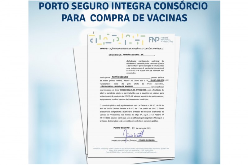 Por este motivo, o Prefeito Jânio Natal formalizou, nesta segunda-feira, 1 de março, a adesão de Porto Seguro ao Consórcio da Frente Nacional de Prefeitos, cujo objetivo é a compra de vacinas contra a COVID-19.