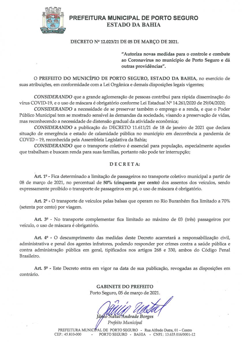 Na tarde desta sexta-feira 05/03, o prefeito de Porto Seguro, Jânio Natal, baixou o Decreto de Nº 12.023/21, que prevê novas regras para a utilização do Transporte Público Municipal por conta da PANDEMIA da Covid-19. As novas determinações terá início a partir do dia 08 de março/2021 com as seguintes regras;