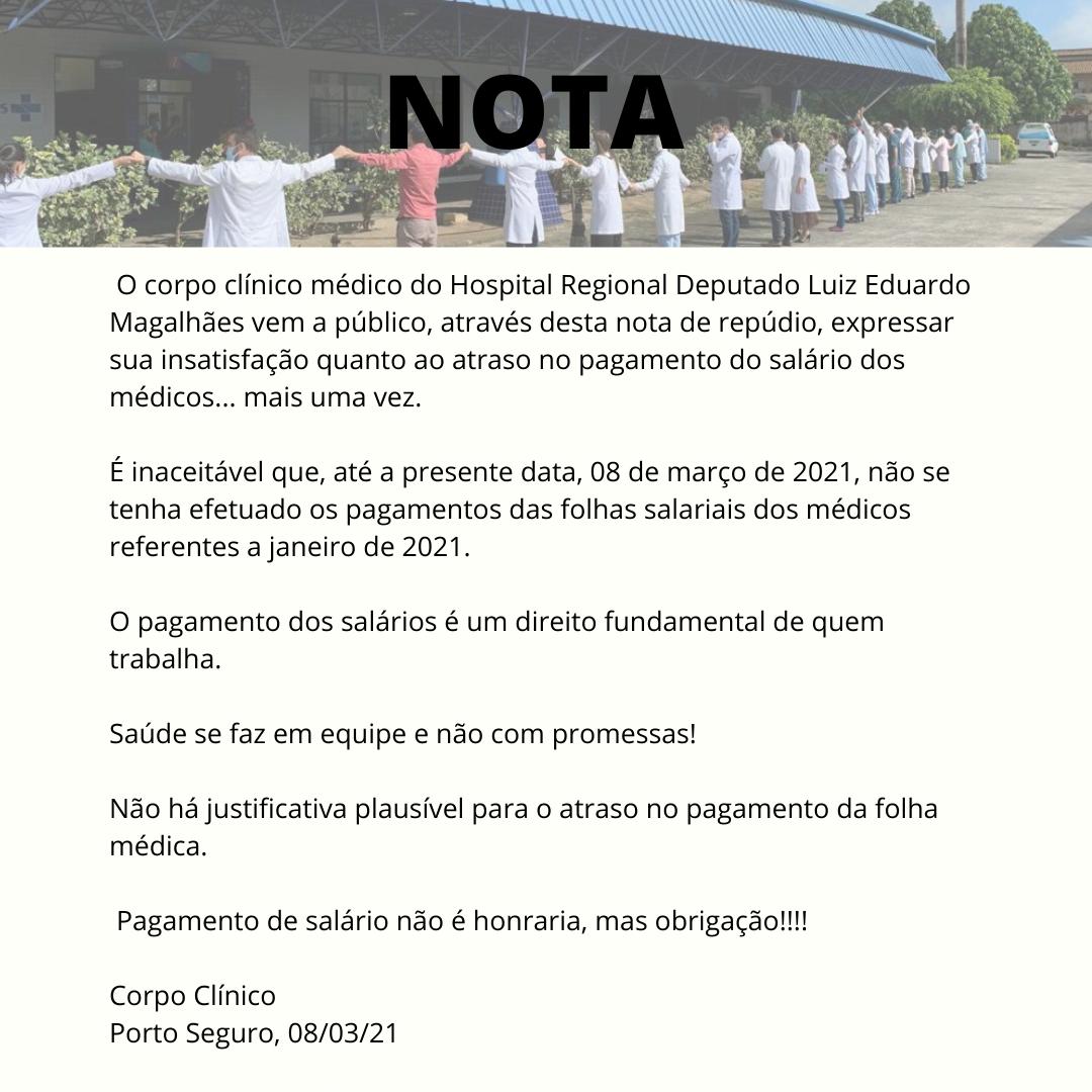 Em plena PANDEMIA, com todos os leitos de UTI fechado por ordem do governador Rui Costa, médicos do HDLEM - Hospital Deputado Luiz Eduardo Magalhães estão à dois meses sem receber salários. A denuncia foi feita na manhã desta segunda-feira 08 de março, através de Nota Pública.