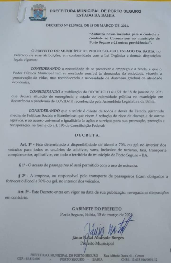Na tarde desta segunda-feira15/03, visando a proteção dos nativos e turista que visitam a Terra Mãe do Brasil, o prefeito Jânio Natal determinada novas exigência para o transporte público municipal. De acordo com o Decreto 12.079/21, passar a ser OBRIGATÓRIO o uso de ÁLCOOL 70% /ou GEL no interior de ônibus, táxi, transporte por aplicativo, transporte complementar, transporte de turismo, inclusive os que chegam à cidade vindo de outros estados e município.