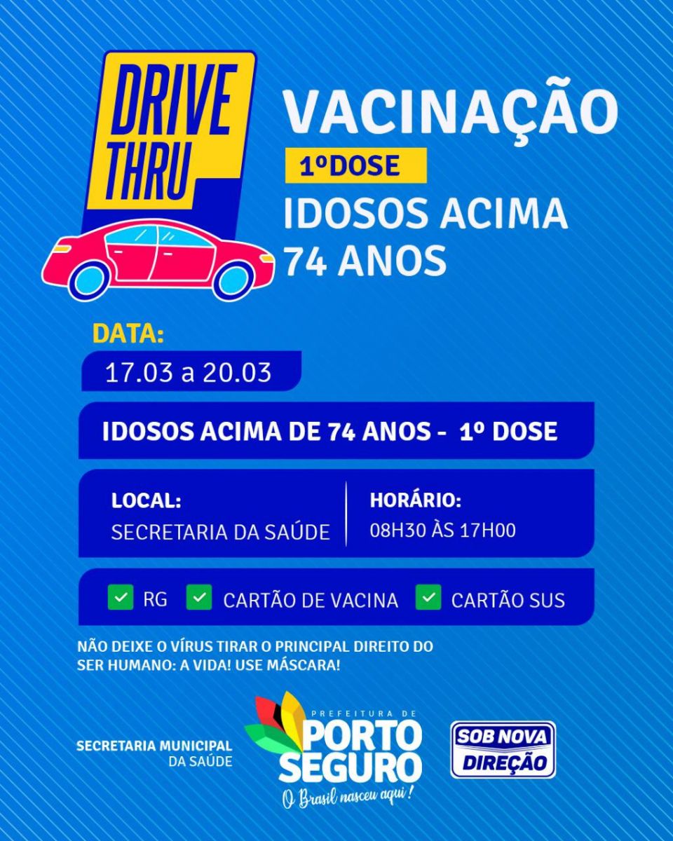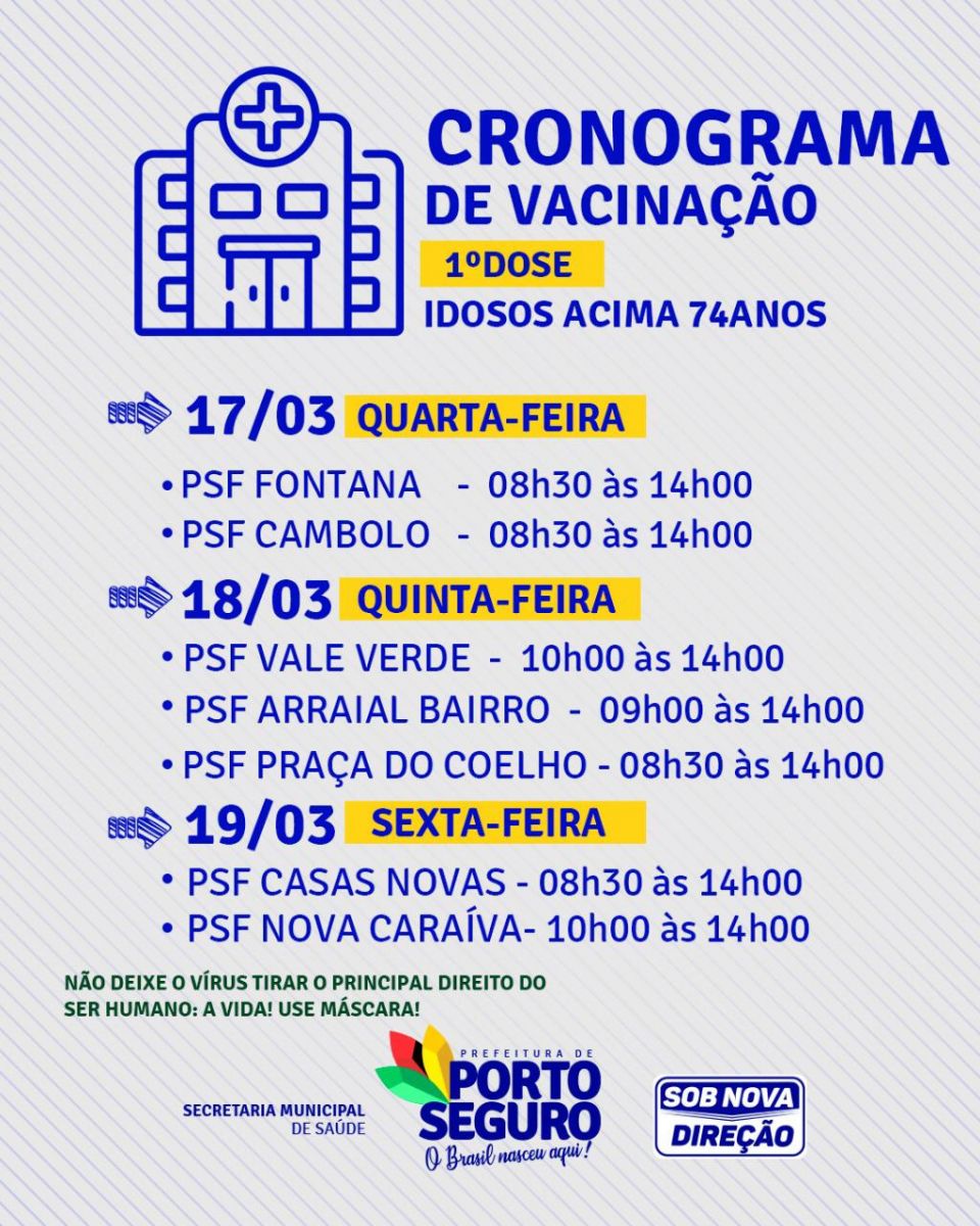 A partir desta quarta-feira (17), a prefeitura de Porto Seguro, agravés da Secretaria Municipal de Saúde, dará continuidade a vacinação com uma nova faixa etária. A vacinação irá atender idosos a partir dos 74 anos, os quais receberão a 1ª dose da vacina contra a COVID-19.