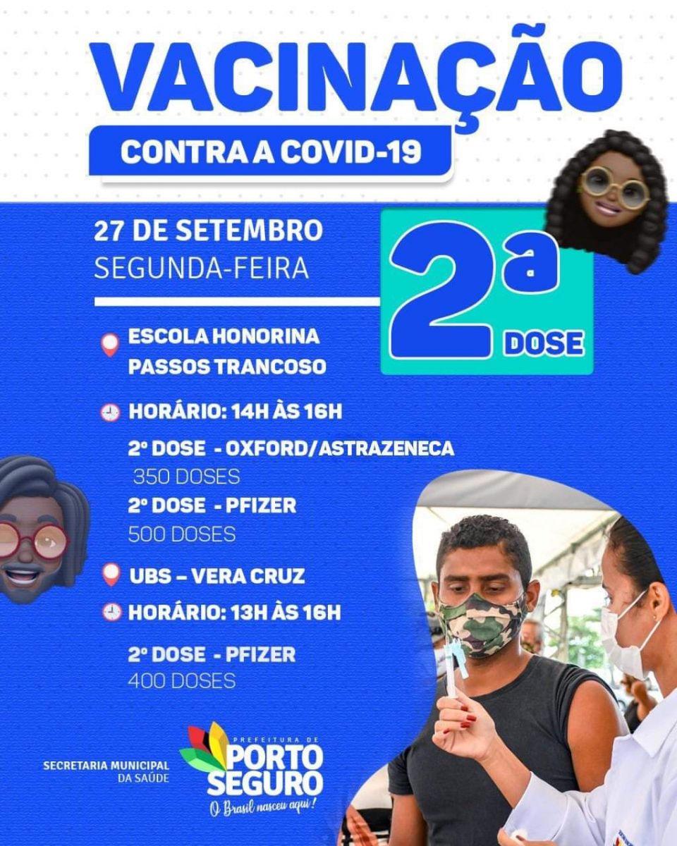 A prefeitura de Porto Seguro, através da Secretaria Municipal de Saúde segue a PRIORIDADE de IMUNIZAÇÃO contra a Covid-19. Veja abaixo o cronograma da imunização de PRIMEIRA, SEGUNDA e TERCEIRA DOSE, além da vacinação para pessoas com COMORBIDADES.