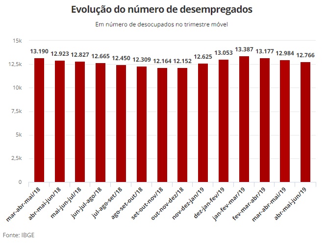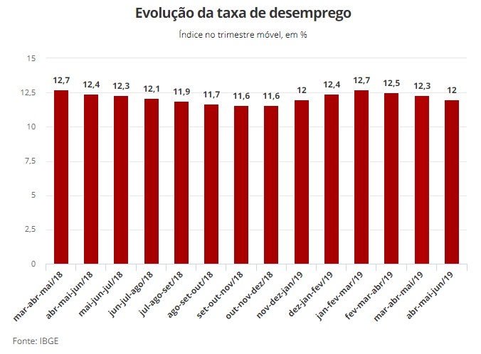 A taxa de desemprego no Brasil caiu para 12% no trimestre encerrado em junho, atingindo 12,8 milhões de pessoas, segundo dados divulgados nesta quarta-feira (31) pelo Instituto Brasileiro de Geografia e Estatística (IBGE). É a terceira queda na comparação com o mês anterior, e representa recuo também em relação ao primeiro trimestre do ano, quando ficou em 12,7%, e em relação ao mesmo período de 2018, quando a taxa foi de 12,4%.