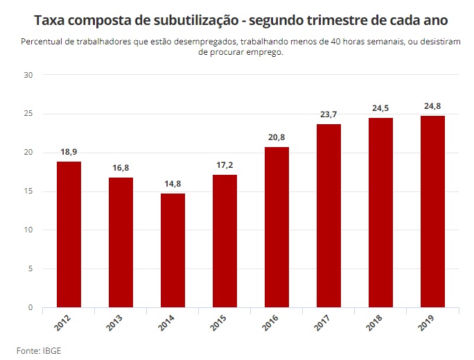 O Brasil encerrou o semestre com uma taxa de subutilização da força de trabalho em 24,8%. Isso significa que falta trabalho para 28,4 milhões de brasileiros – um leve recuo frente à taxa de 25% registrada no trimestre encerrado em maio. Na comparação com junho do ano passado, no entanto, essa população aumentou em 3,4%, o que corresponde a 923 mil trabalhadores subutilizados a mais.