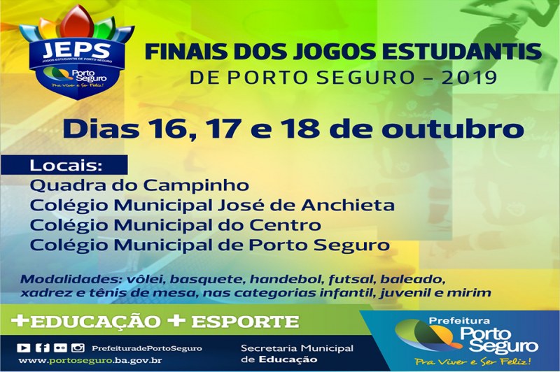 Nos dias 16, 17 e 18 de outubro, os atletas de rede municipal de ensino de Porto Seguro estarão vibrando nas arquibancadas ou disputando medalhas nas quadras do bairro Campinho, Colégio Municipal José de Anchieta e Colégio Municipal do Centro. No dia 16, serão disputadas as modalidades de futsal mirim, baleado infantil e tênis de mesa. Dia 17, vêm as partidas de futsal infantil, vôlei e baleado juvenil. No último dia, serão realizados os jogos do juvenil, com futsal masculino e feminino, handebol, basquete e atletismo, que será disputado no Estádio Municipal.