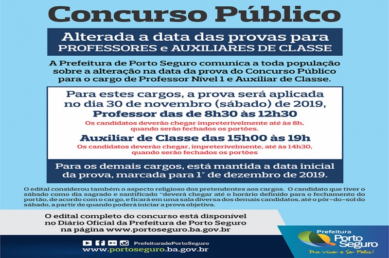 A Prefeitura de Porto Seguro publicou no Diário Oficial do dia 20/11 um edital informando sobre a alteração na data da prova do Concurso Público para os cargos de Professor Nível 1 e Auxiliar de Classe. A prova será aplicada no dia 30 de novembro (sábado) de 2019, das de 8h30 às 12h30 para o cargo de Professor e das 15h às 19h para Auxiliar de classe. Os candidatos deverão chegar impreterivelmente meia hora antes do horário previsto para as provas, quando serão fechados os portões.