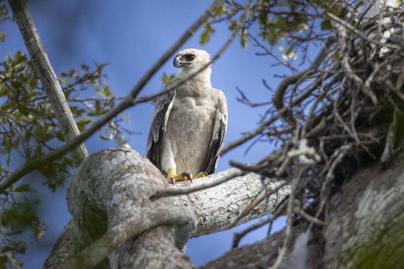 Eunápolis, 25 de abril de 2022 – Um exemplar raríssimo de harpia (Harpia harpyja), a maior águia das Américas, foi fotografado próximo ao seu ninho na região do município de Belmonte, no sul baiano. A presença da ave tem imenso valor, pois a espécie corre risco e é extremamente rara na Bahia. O ninho da ave foi encontrado pelo Projeto Harpia em uma fazenda, após o filhote ter sido avistado pelos proprietários da área.