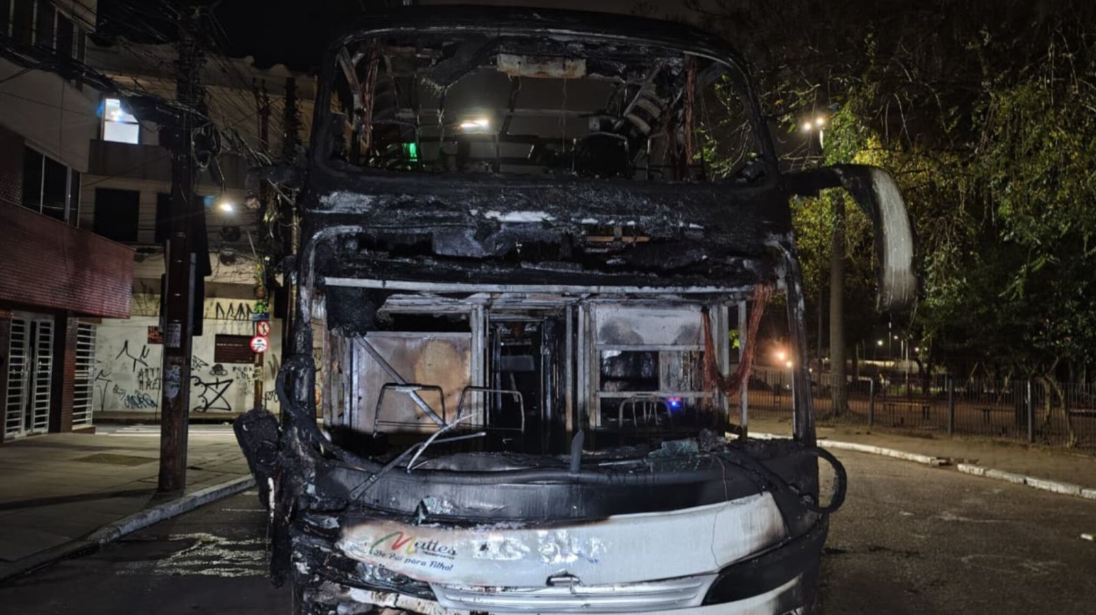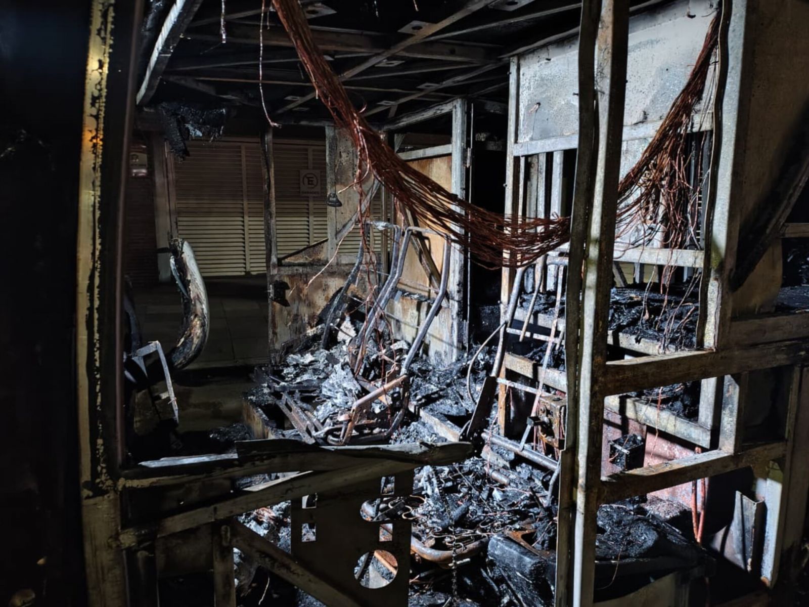 Nas fotos, é possível ver que os bancos foram consumidos pelas chamas, restando apenas estruturas metálicas retorcidas. Fios pendem do teto, e o revestimento interno está carbonizado. O corredor do ônibus está coberto por fuligem, e partes da lataria foram deformadas pelo calor.