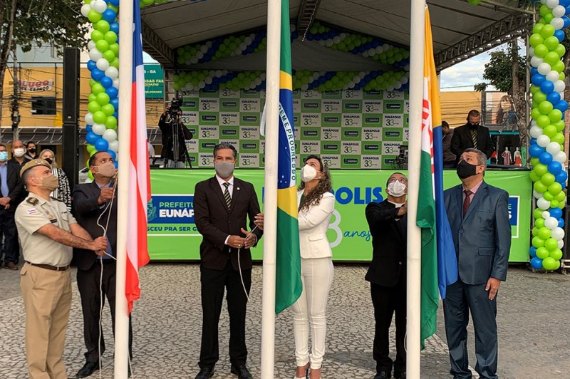 Para celebrar o aniversário de 33 anos da emancipação político-administrativa de Eunápolis, a Prefeitura Municipal realizou na manhã desta quarta-feira (12), uma celebração, na praça da bandeira. A solenidade que aconteceu com número reduzido de pessoas, respeitando os protocolos sanitários de prevenção à Covid-19, teve início às 6:00 horas, com o ato cívico de Hasteamento das Bandeiras do Brasil, da Bahia e de Eunápolis. Em seguida, a prefeita Cordélia Torres fez um breve discurso, parabenizando o município pela comemoração dos seus 33 anos.