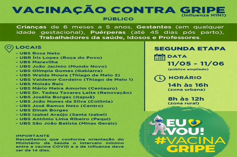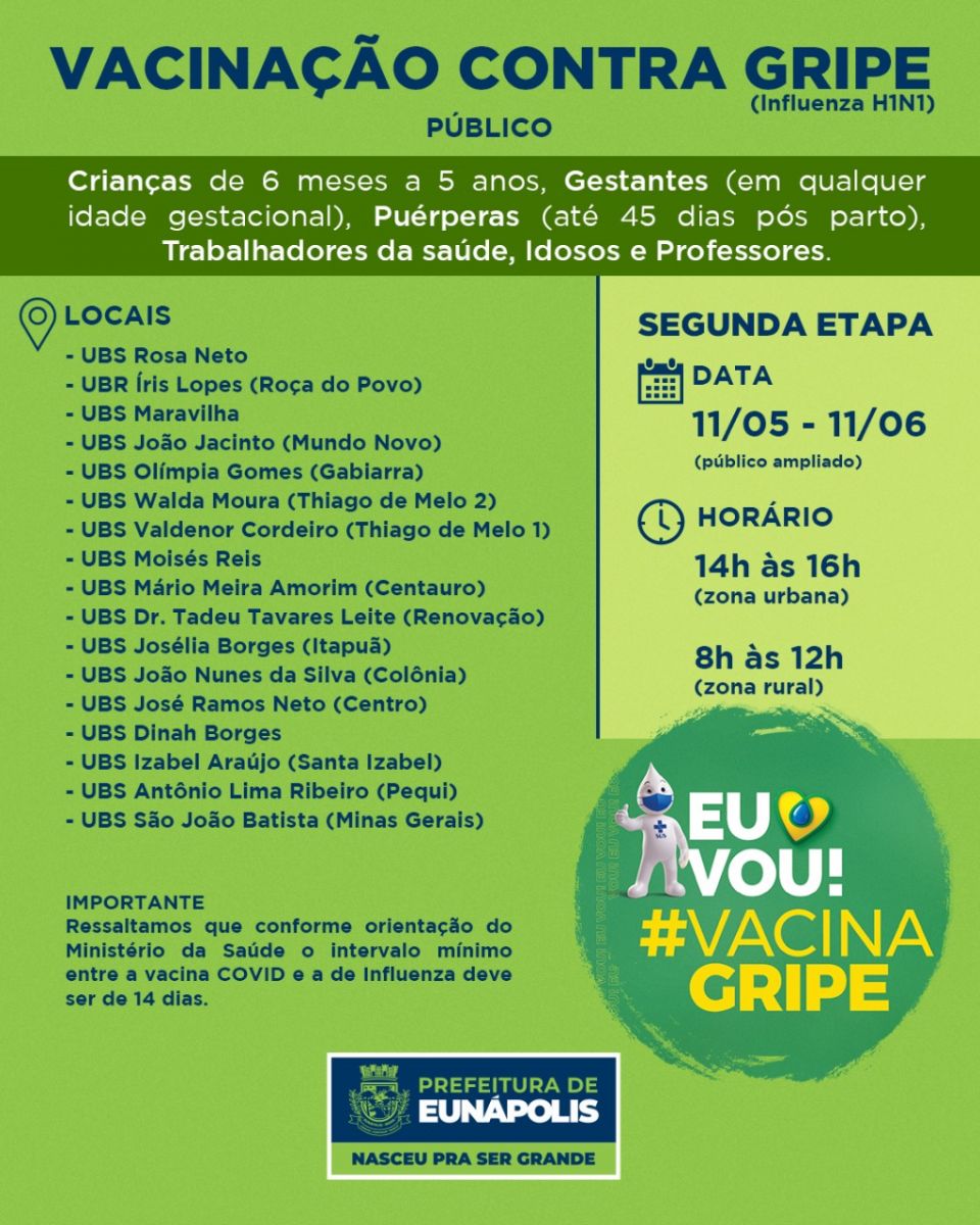 A Prefeitura Municipal de Eunápolis disponibilizou novos grupos da vacinação contra a Influenza. As vacinas estão disponíveis nas principais unidades de saúde e inclusive, na Zona Rural, no período de 17 de Maio a 8 de Junho. Nesse novo grupo serão vacinadas crianças acima de 6 meses e menores de 6 anos, gestantes, puérperas, trabalhadores da saúde, idoso acima de 60 anos e professores, conforme estabeleceu o Ministério da Saúde.