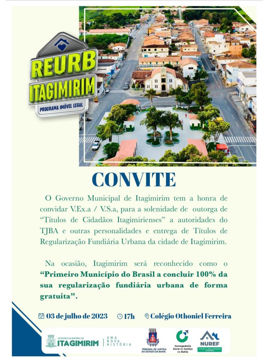Com uma administração que se destaca por atuar com eficácia em todas as áreas da gestão pública, o governo municipal de Itagimirim entra para a 'História do Brasil', como a primeira cidade a concluir 100% o REURB - 'Regularização Fundiária Urbana', sede e distrito. O título de reconhecimento oficial deste importante feito, acontene na próxima segunda-feira 03/07.