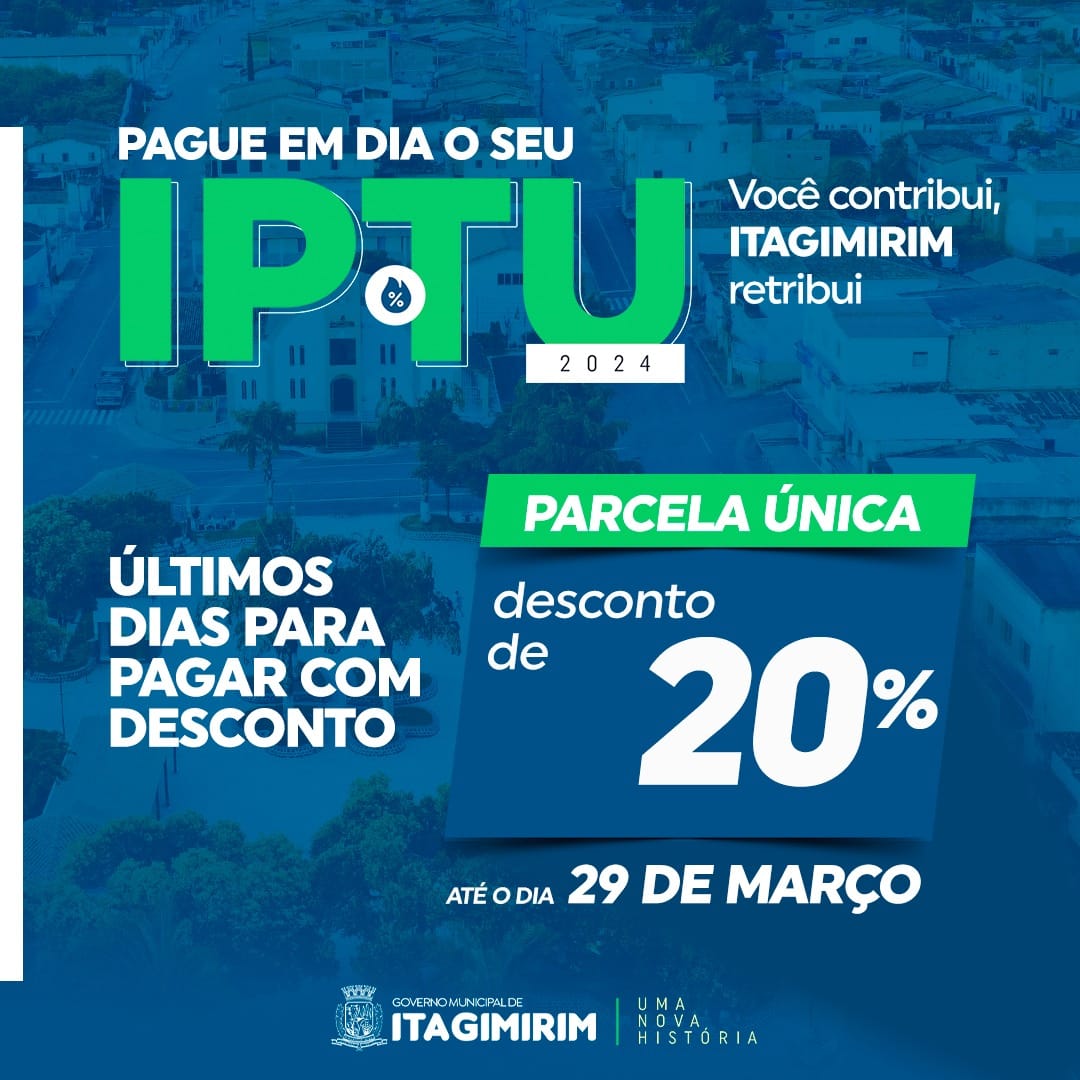 A prefeitura de Itagimirim alerta aos contribuintes sobre o fim do prazo para pagamento do IPTU - Imposto Predial Territorial Urbano 2024, o prazo de pagamento com desconto chega chega ao fim em 29/03/2024. Pagando em 'Cota Única' até esta data, o contrubuinte tem desconto de 20%.