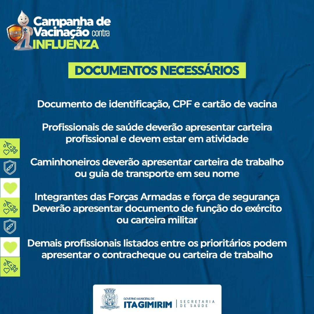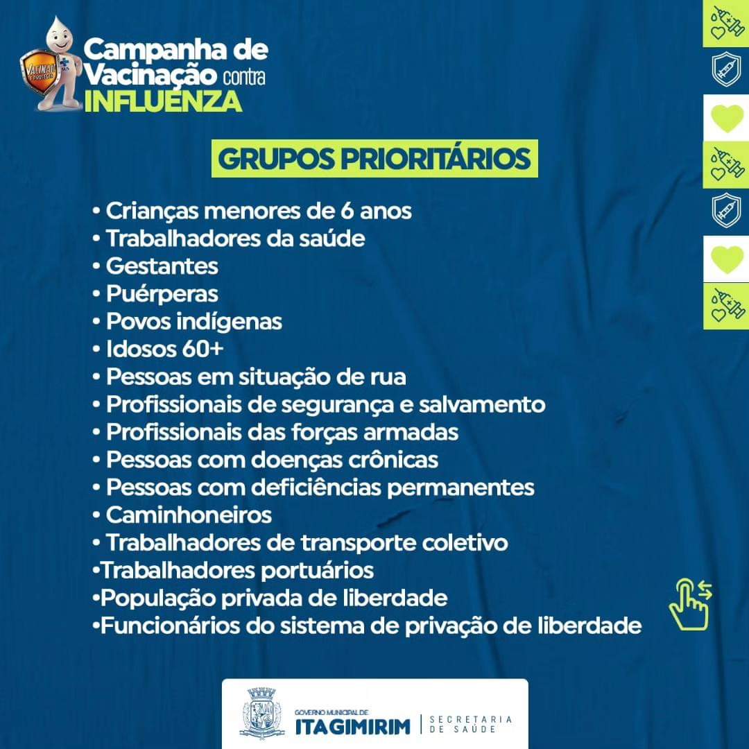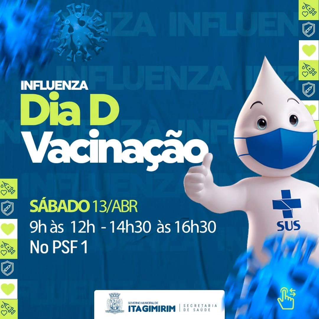 A prefeitura de Itagimirim, através da Secretaria Municipal de Saúde, promove no próximo sábado 13/04, o dia Dia D da Campanha Nacional de Vacinação contra a Influenza.